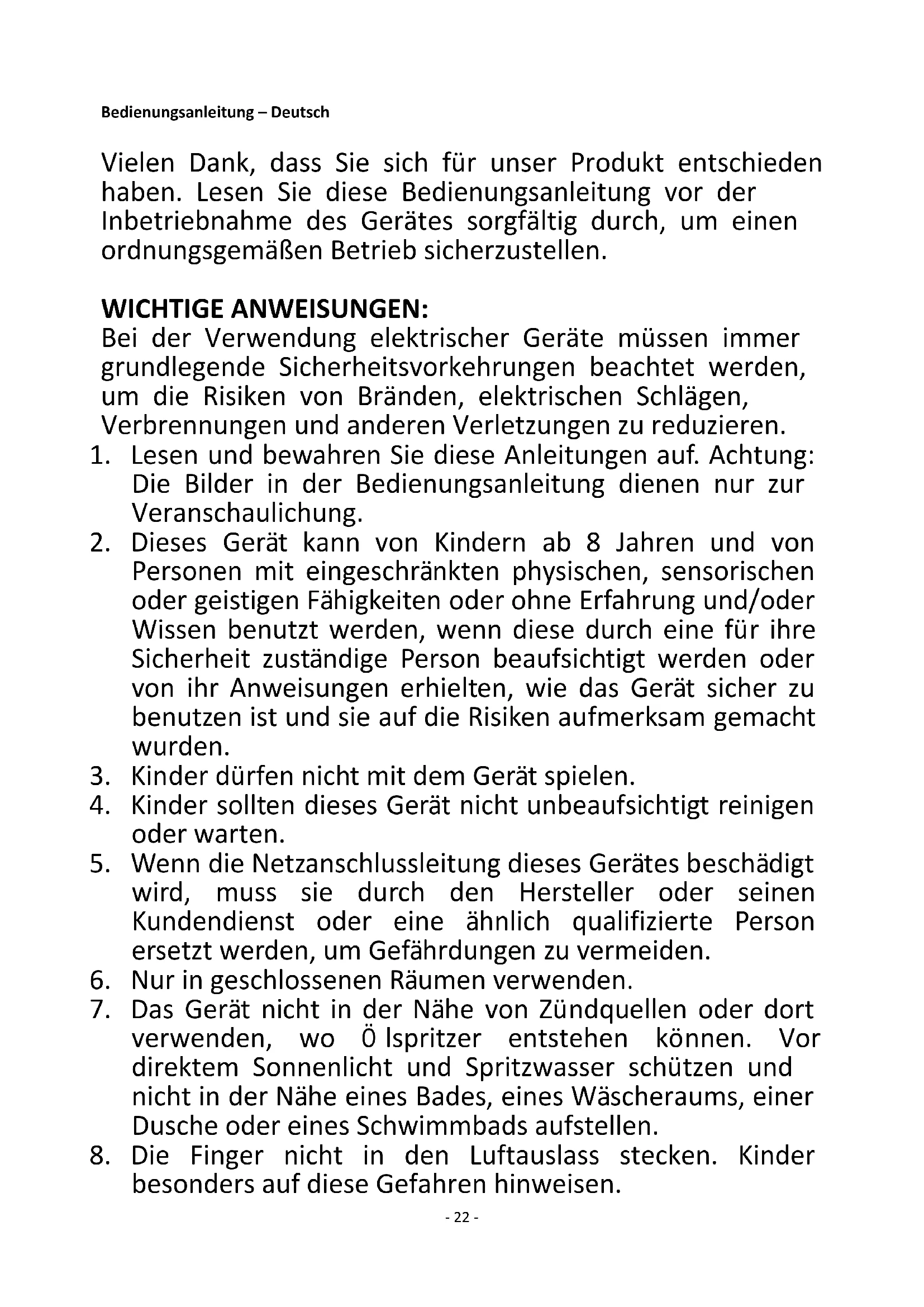 1. Lesen und bewahren Sie diese Anleitungen auf. Achtung: