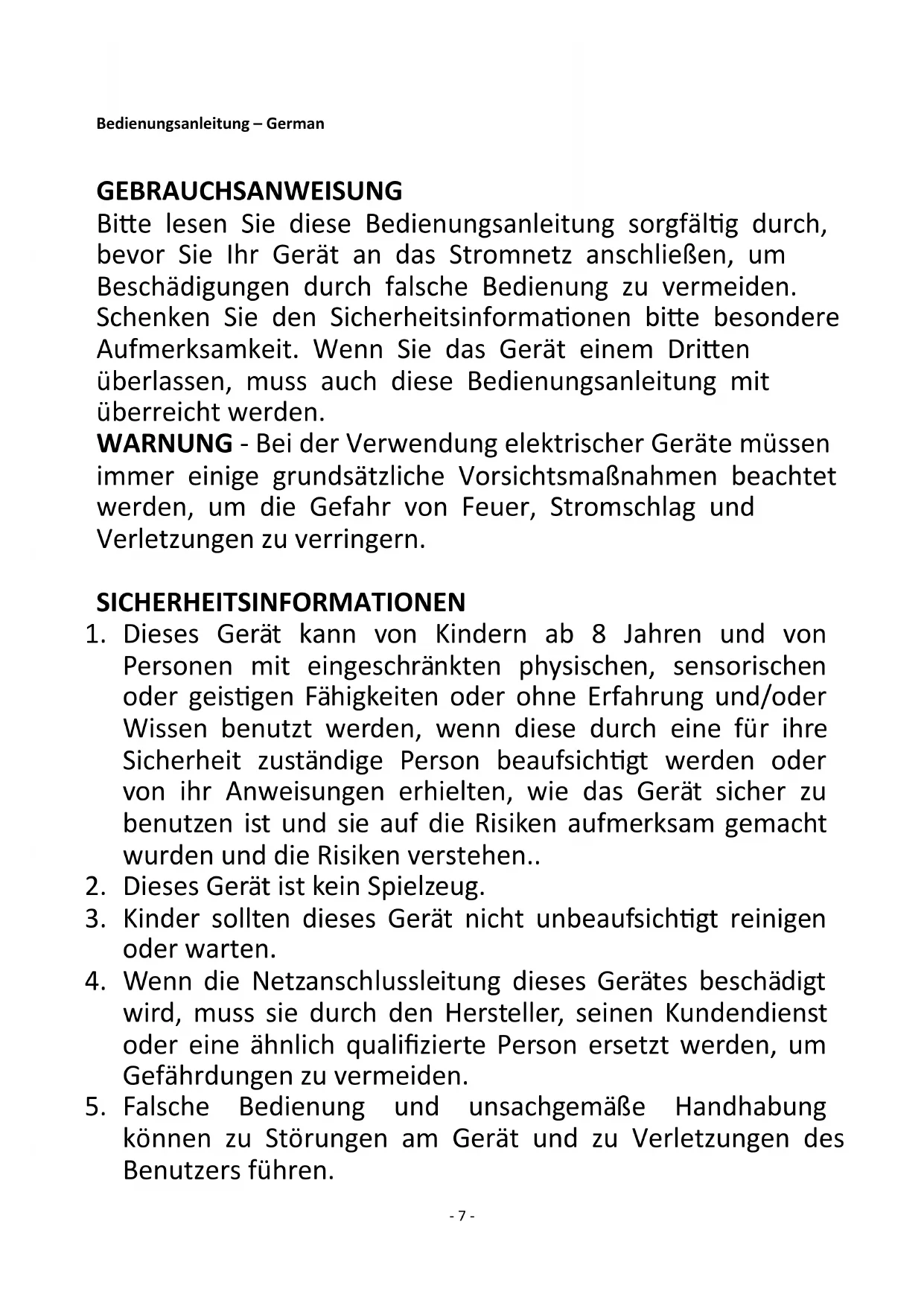 Recycling – European Directive 2012/19/EU This marking indicates that this product should not be disposed with other household wastes. To prevent possible harm to the environment or human health from uncontrolled waste disposal, recycle it responsibly to promote the sustainable reuse of material resources. To return your used device, please use the return and collection systems or contact the retailer where the product was purchased. They can take this product for environmental safe recycling. BATTERY MUST BE RECYCLED OR DISPOSED OF PROPERLY. DO NOT OPEN. DO NOT DISPOSE OR IN FIRE OR SHORT CIRCUIT. POCO Service AG Industriestraße 17 59192 Bergkamen Germany- 7 - Bedienungsanleitung – German GEBRAUCHSANWEISUNG Bitte lesen Sie diese Bedienungsanleitung sorgfältig durch, bevor Sie Ihr Gerät an das Stromnetz anschließen, um Beschädigungen durch falsche Bedienung zu vermeiden. Schenken Sie den Sicherheitsinformationen bitte besondere Aufmerksamkeit. Wenn Sie das Gerät einem Dritten überlassen, muss auch diese Bedienungsanleitung mit überreicht werden. WARNUNG - Bei der Verwendung elektrischer Geräte müssen immer einige grundsätzliche Vorsichtsmaßnahmen beachtet werden, um die Gefahr von Feuer, Stromschlag und Verletzungen zu verringern. SICHERHEITSINFORMATIONEN
