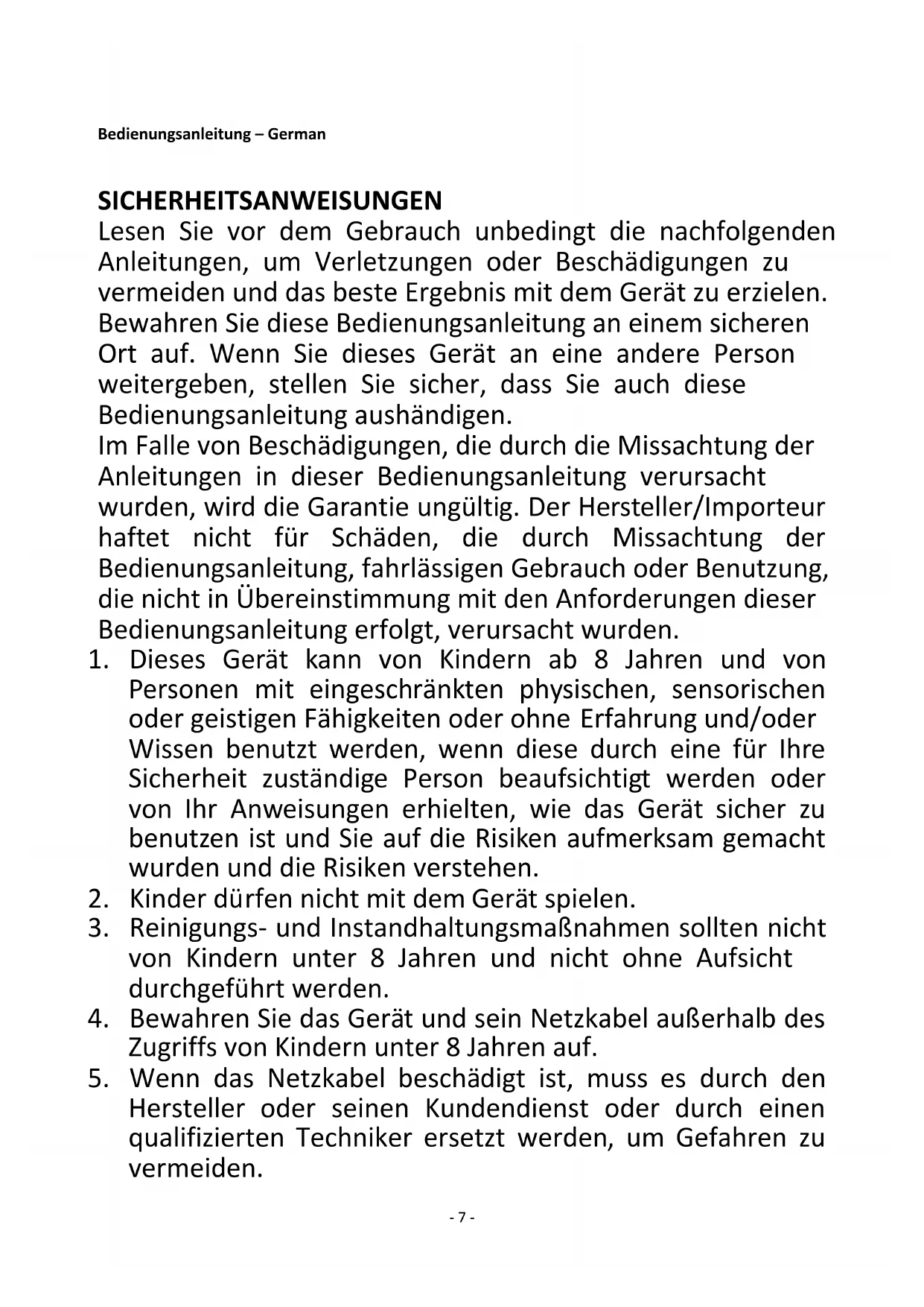 Emerio B.V. Customer service: Kundeninformation: Klantenservice: Oudeweg 115 T: +31 (0) 23 3034369 T: +49 (0) 3222 1097 600 T: +31 (0) 23 3034369 2031 CC Haarlem www.emerio.eu/service www.emerio.eu/service www.emerio.eu/service The Netherlands- 7 - Bedienungsanleitung – German SICHERHEITSANWEISUNGEN Lesen Sie vor dem Gebrauch unbedingt die nachfolgenden Anleitungen, um Verletzungen oder Beschädigungen zu vermeiden und das beste Ergebnis mit dem Gerät zu erzielen. Bewahren Sie diese Bedienungsanleitung an einem sicheren Ort auf. Wenn Sie dieses Gerät an eine andere Person weitergeben, stellen Sie sicher, dass Sie auch diese Bedienungsanleitung aushändigen. Im Falle von Beschädigungen, die durch die Missachtung der Anleitungen in dieser Bedienungsanleitung verursacht wurden, wird die Garantie ungültig. Der Hersteller/Importeur haftet nicht für Schäden, die durch Missachtung der Bedienungsanleitung, fahrlässigen Gebrauch oder Benutzung, die nicht in Übereinstimmung mit den Anforderungen dieser Bedienungsanleitung erfolgt, verursacht wurden.