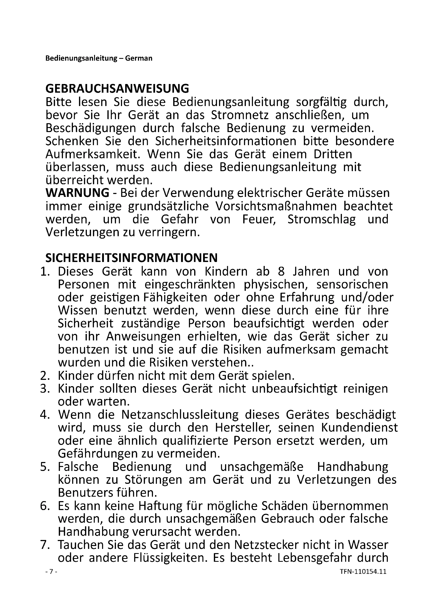 BATTERY MUST BE RECYCLED OR DISPOSED OF PROPERLY. DO NOT OPEN. DO NOT DISPOSE OR IN FIRE OR SHORT CIRCUIT.- 7 - TFN-110154.11 Bedienungsanleitung – German GEBRAUCHSANWEISUNG Bitte lesen Sie diese Bedienungsanleitung sorgfältig durch, bevor Sie Ihr Gerät an das Stromnetz anschließen, um Beschädigungen durch falsche Bedienung zu vermeiden. Schenken Sie den Sicherheitsinformationen bitte besondere Aufmerksamkeit. Wenn Sie das Gerät einem Dritten überlassen, muss auch diese Bedienungsanleitung mit überreicht werden. WARNUNG - Bei der Verwendung elektrischer Geräte müssen immer einige grundsätzliche Vorsichtsmaßnahmen beachtet werden, um die Gefahr von Feuer, Stromschlag und Verletzungen zu verringern. SICHERHEITSINFORMATIONEN