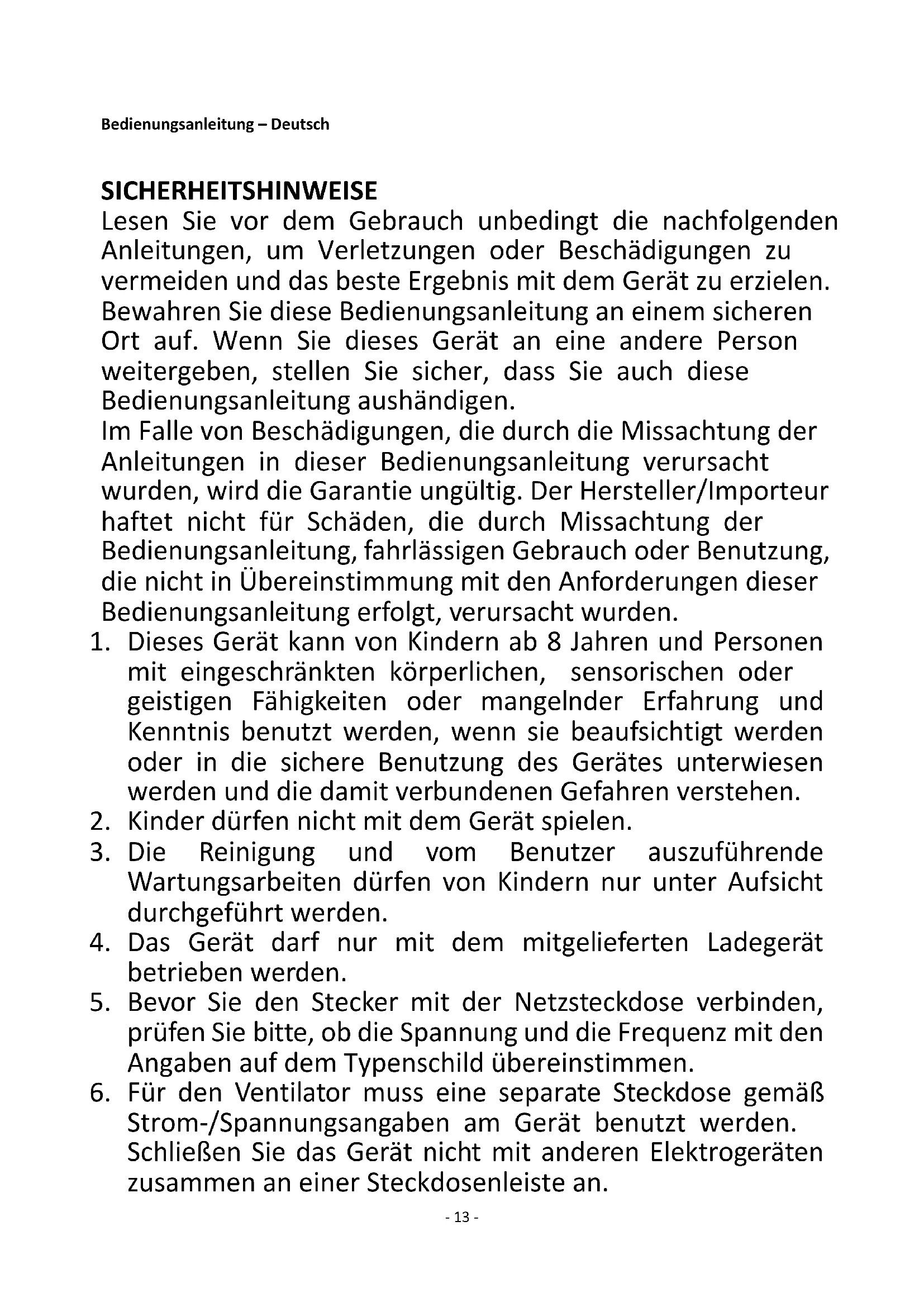 Regarding information for consumers on how to install, use and maintain the product, WEEE information, please check the instruction manual provided with packaging.- 13 - Bedienungsanleitung – Deutsch SICHERHEITSHINWEISE Lesen Sie vor dem Gebrauch unbedingt die nachfolgenden Anleitungen, um Verletzungen oder Beschädigungen zu vermeiden und das beste Ergebnis mit dem Gerät zu erzielen. Bewahren Sie diese Bedienungsanleitung an einem sicheren Ort auf. Wenn Sie dieses Gerät an eine andere Person weitergeben, stellen Sie sicher, dass Sie auch diese Bedienungsanleitung aushändigen. Im Falle von Beschädigungen, die durch die Missachtung der Anleitungen in dieser Bedienungsanleitung verursacht wurden, wird die Garantie ungültig. Der Hersteller/Importeur haftet nicht für Schäden, die durch Missachtung der Bedienungsanleitung, fahrlässigen Gebrauch oder Benutzung, die nicht in Übereinstimmung mit den Anforderungen dieser Bedienungsanleitung erfolgt, verursacht wurden.