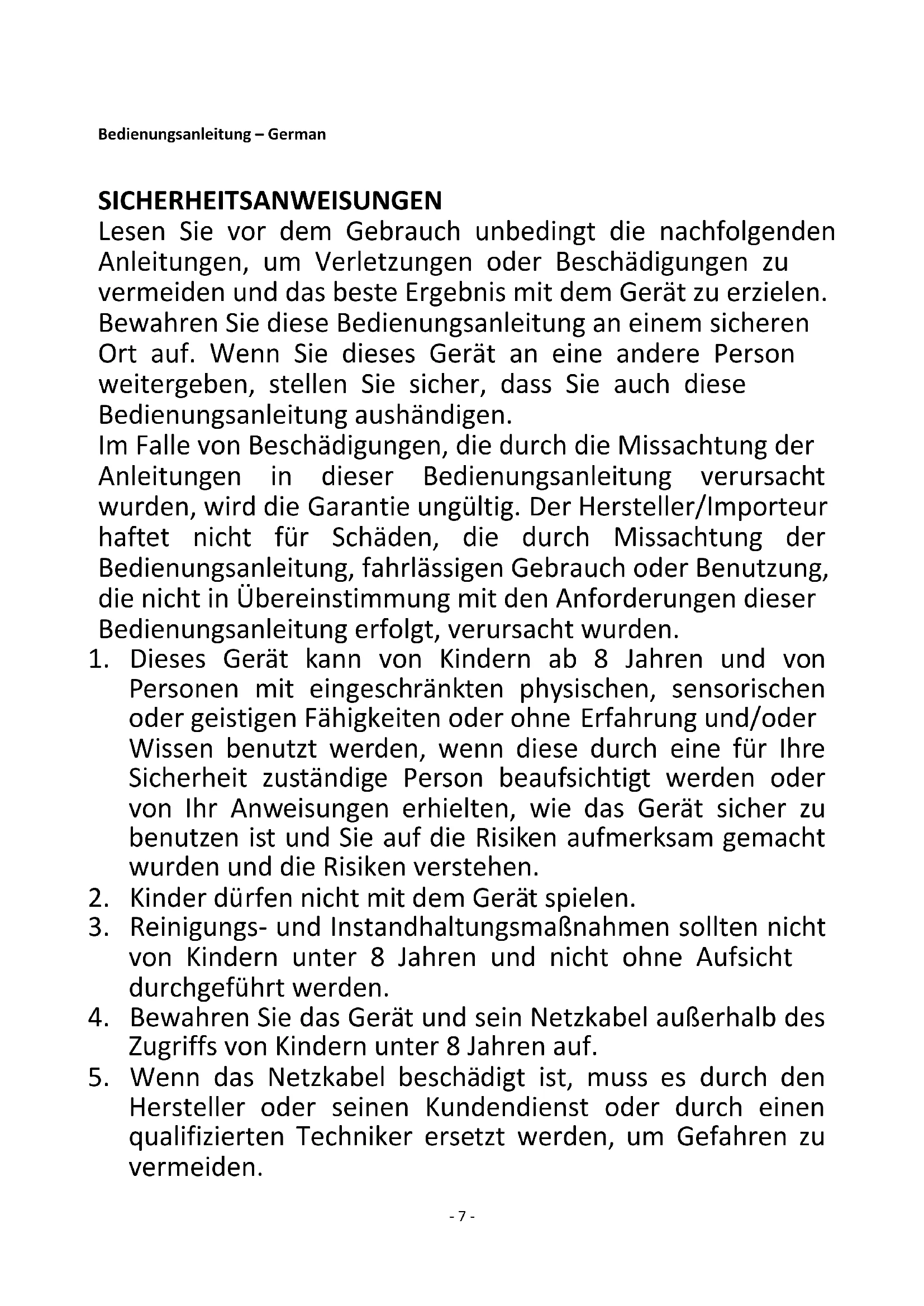 Hersteller oder seinen Kundendienst oder durch einen qualifizierten Techniker ersetzt werden, um Gefahren zu vermeiden.- 8 -
