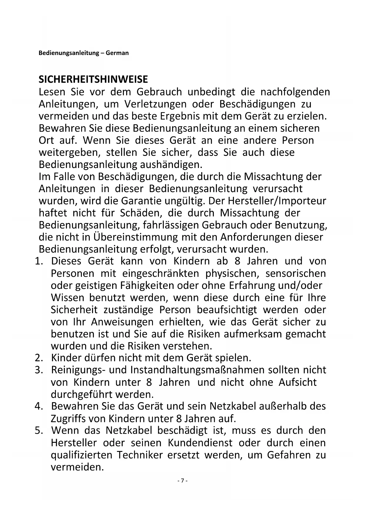 The Netherlands Looking for spare parts? Have a look at https://spareparts.emerio.eu Sie brauchen Ersatzteile? Besuchen Sie https://ersatzteile.emerio.eu Onderdelen nodig? Kijk op https://onderdelen.emerio.eu- 7 - Bedienungsanleitung – German SICHERHEITSHINWEISE Lesen Sie vor dem Gebrauch unbedingt die nachfolgenden Anleitungen, um Verletzungen oder Beschädigungen zu vermeiden und das beste Ergebnis mit dem Gerät zu erzielen. Bewahren Sie diese Bedienungsanleitung an einem sicheren Ort auf. Wenn Sie dieses Gerät an eine andere Person weitergeben, stellen Sie sicher, dass Sie auch diese Bedienungsanleitung aushändigen. Im Falle von Beschädigungen, die durch die Missachtung der Anleitungen in dieser Bedienungsanleitung verursacht wurden, wird die Garantie ungültig. Der Hersteller/Importeur haftet nicht für Schäden, die durch Missachtung der Bedienungsanleitung, fahrlässigen Gebrauch oder Benutzung, die nicht in Übereinstimmung mit den Anforderungen dieser Bedienungsanleitung erfolgt, verursacht wurden.
