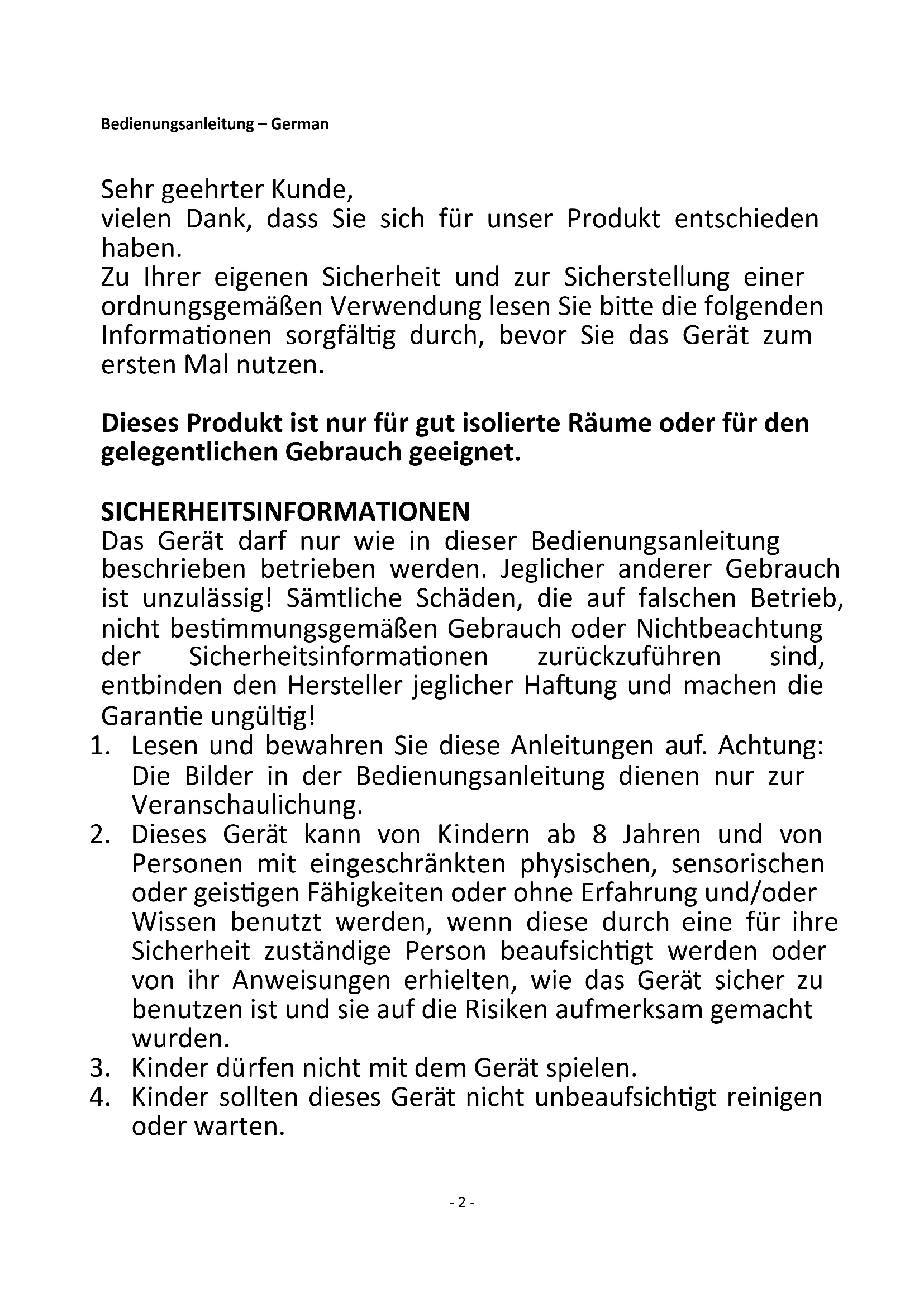 1. Lesen und bewahren Sie diese Anleitungen auf. Achtung: