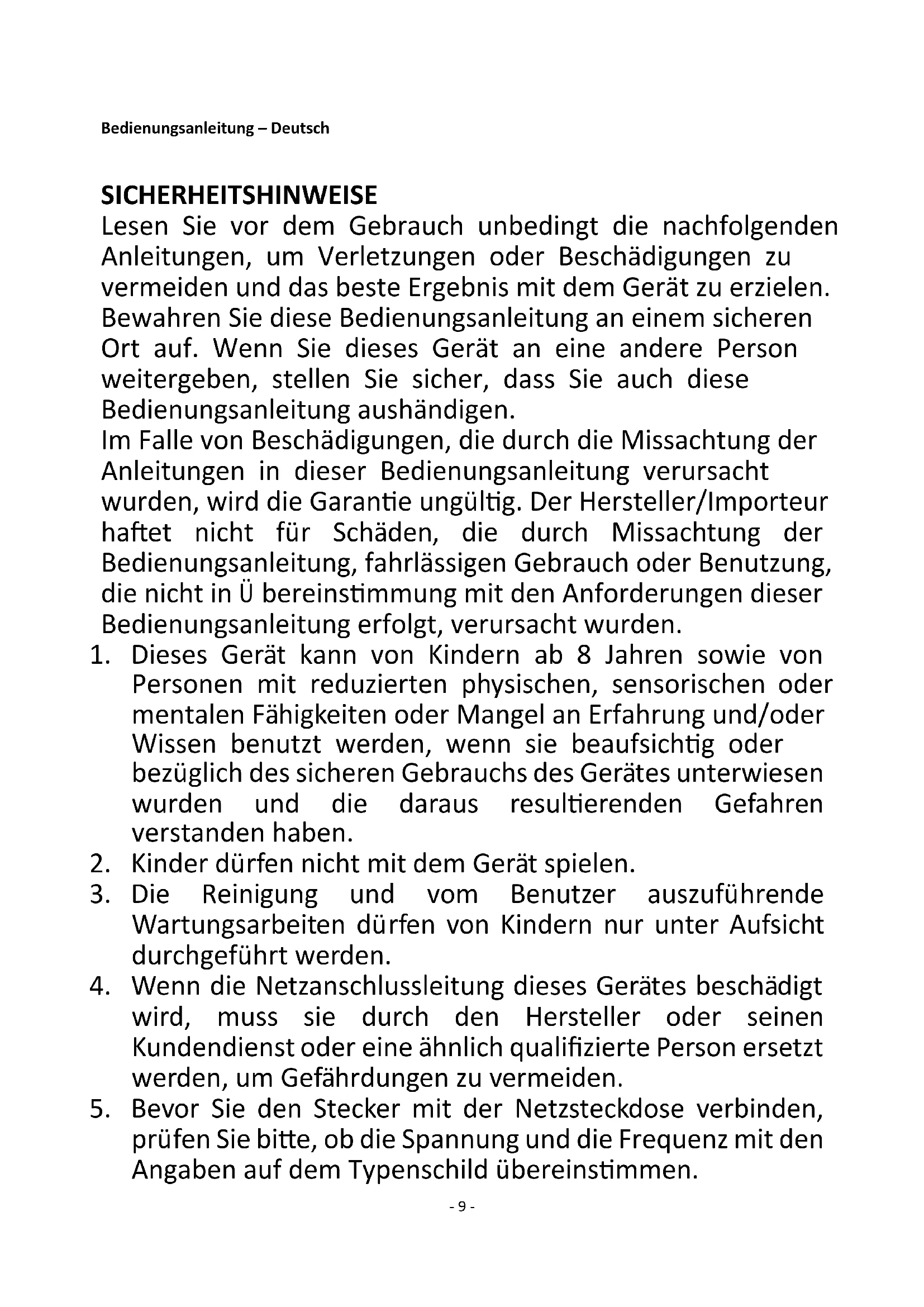 Recycling – European Directive 2012/19/EU This marking indicates that this product should not be disposed with other household wastes. To prevent possible harm to the environment or human health from uncontrolled waste disposal, recycle it responsibly to promote the sustainable reuse of material resources. To return your used device, please use the return and collection systems or contact the retailer where the product was purchased. They can take this product for environmentally safe recycling. LIPO Einrichtungsmärkte AG, Rüti Center, Rütiweg 7, CH-4133 Pratteln- 9 - Bedienungsanleitung – Deutsch SICHERHEITSHINWEISE Lesen Sie vor dem Gebrauch unbedingt die nachfolgenden Anleitungen, um Verletzungen oder Beschädigungen zu vermeiden und das beste Ergebnis mit dem Gerät zu erzielen. Bewahren Sie diese Bedienungsanleitung an einem sicheren Ort auf. Wenn Sie dieses Gerät an eine andere Person weitergeben, stellen Sie sicher, dass Sie auch diese Bedienungsanleitung aushändigen. Im Falle von Beschädigungen, die durch die Missachtung der Anleitungen in dieser Bedienungsanleitung verursacht wurden, wird die Garantie ungültig. Der Hersteller/Importeur haftet nicht für Schäden, die durch Missachtung der Bedienungsanleitung, fahrlässigen Gebrauch oder Benutzung, die nicht in Ü bereinstimmung mit den Anforderungen dieser Bedienungsanleitung erfolgt, verursacht wurden.