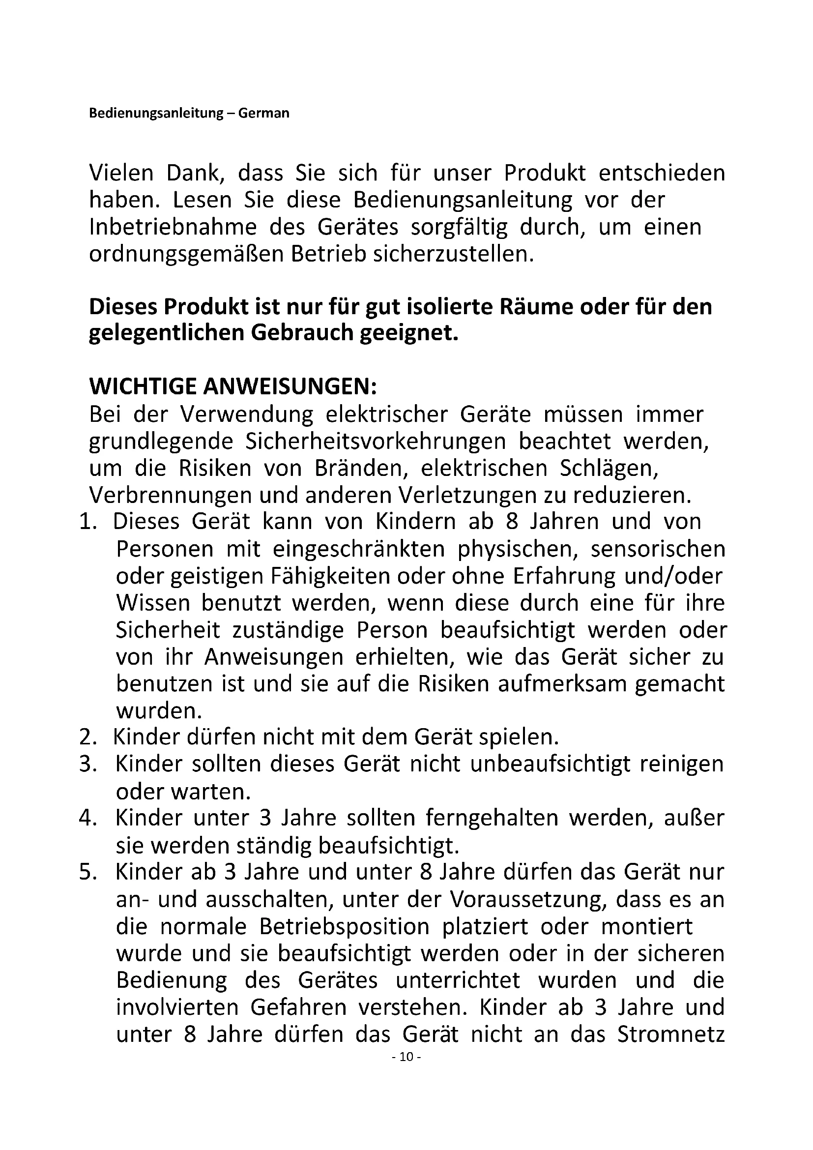 Satisfies the requirement of the Council Directives: COMMISSION REGULATION (EU) No 2015/1188 of 28 April 2015 and Amending COMMISSION REGULATION (EU) 2016/2282 implementing Directive 2009/125/EC of the European Parliament and of the Council with regard to ecodesign requirements for local space heaters Regarding information for consumers on how to install, use and maintain the product, WEEE information, please check the instruction manual provided with packaging.- 10 - Bedienungsanleitung – German Vielen Dank, dass Sie sich für unser Produkt entschieden haben. Lesen Sie diese Bedienungsanleitung vor der Inbetriebnahme des Gerätes sorgfältig durch, um einen ordnungsgemäßen Betrieb sicherzustellen. Dieses Produkt ist nur für gut isolierte Räume oder für den gelegentlichen Gebrauch geeignet. WICHTIGE ANWEISUNGEN: Bei der Verwendung elektrischer Geräte müssen immer grundlegende Sicherheitsvorkehrungen beachtet werden, um die Risiken von Bränden, elektrischen Schlägen, Verbrennungen und anderen Verletzungen zu reduzieren.