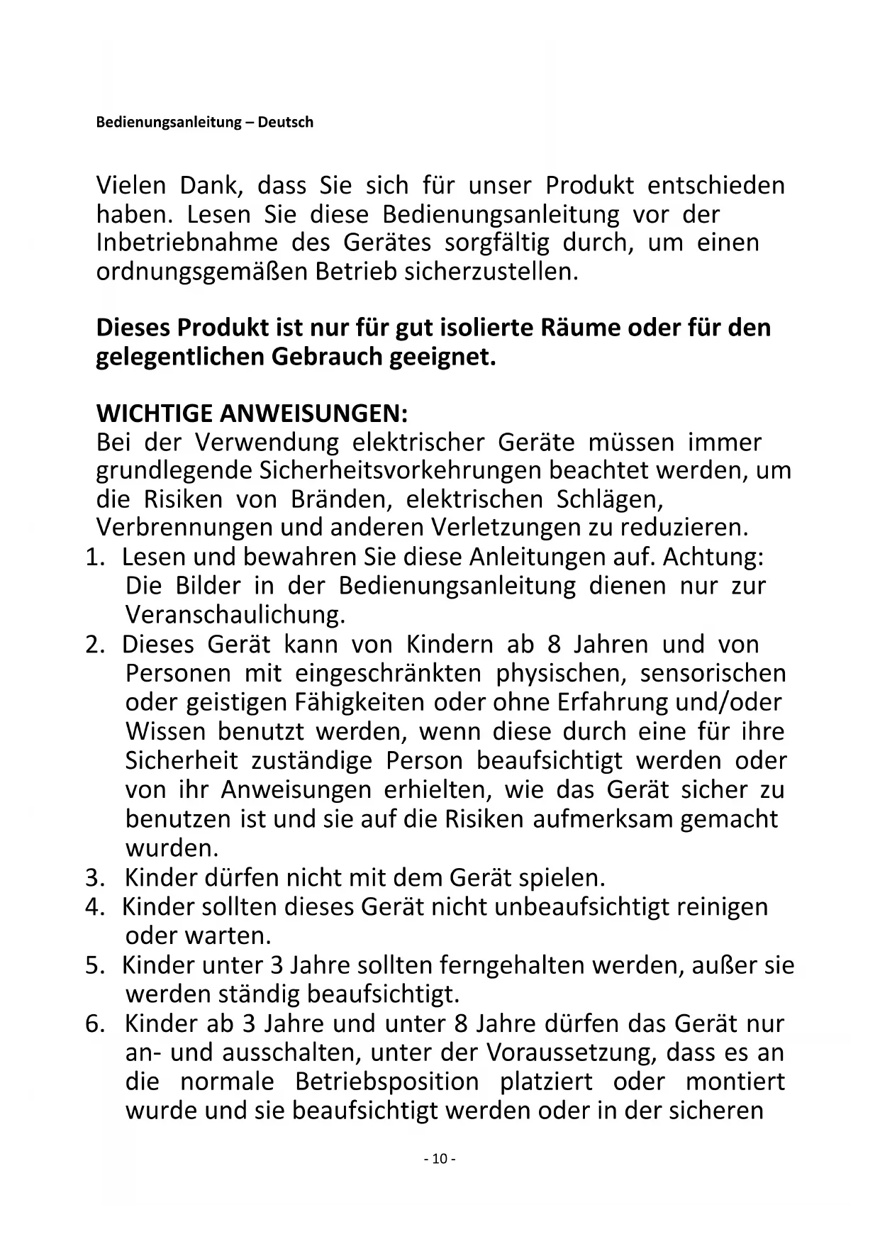 Satisfies the requirement of the Council Directives: COMMISSION REGULATION (EU) No 2015/1188 of 28 April 2015 and Amending COMMISSION REGULATION (EU) 2016/2282 implementing Directive 2009/125/EC of the European Parliament and of the Council with regard to ecodesign requirements for local space heaters Regarding information for consumers on how to install, use and maintain the product, WEEE information, please check the instruction manual provided with packaging.- 10 - Bedienungsanleitung – Deutsch Vielen Dank, dass Sie sich für unser Produkt entschieden haben. Lesen Sie diese Bedienungsanleitung vor der Inbetriebnahme des Gerätes sorgfältig durch, um einen ordnungsgemäßen Betrieb sicherzustellen. Dieses Produkt ist nur für gut isolierte Räume oder für den gelegentlichen Gebrauch geeignet. WICHTIGE ANWEISUNGEN: Bei der Verwendung elektrischer Geräte müssen immer grundlegende Sicherheitsvorkehrungen beachtet werden, um die Risiken von Bränden, elektrischen Schlägen, Verbrennungen und anderen Verletzungen zu reduzieren.