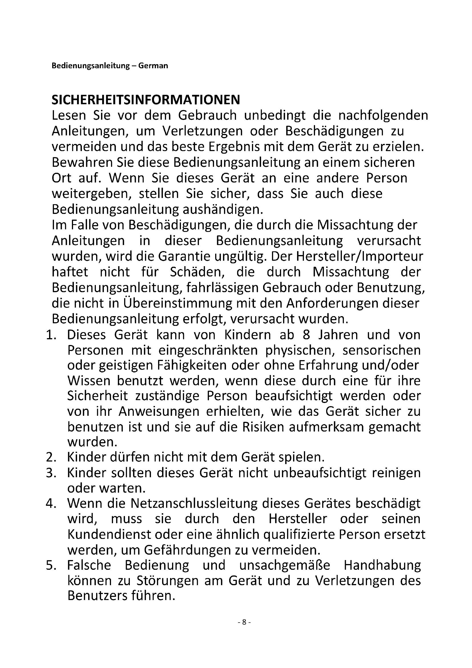 Regarding information for consumers on how to install, use and maintain the product, WEEE information, please check the instruction manual provided with packaging.- 8 - Bedienungsanleitung – German SICHERHEITSINFORMATIONEN Lesen Sie vor dem Gebrauch unbedingt die nachfolgenden Anleitungen, um Verletzungen oder Beschädigungen zu vermeiden und das beste Ergebnis mit dem Gerät zu erzielen. Bewahren Sie diese Bedienungsanleitung an einem sicheren Ort auf. Wenn Sie dieses Gerät an eine andere Person weitergeben, stellen Sie sicher, dass Sie auch diese Bedienungsanleitung aushändigen. Im Falle von Beschädigungen, die durch die Missachtung der Anleitungen in dieser Bedienungsanleitung verursacht wurden, wird die Garantie ungültig. Der Hersteller/Importeur haftet nicht für Schäden, die durch Missachtung der Bedienungsanleitung, fahrlässigen Gebrauch oder Benutzung, die nicht in Übereinstimmung mit den Anforderungen dieser Bedienungsanleitung erfolgt, verursacht wurden.