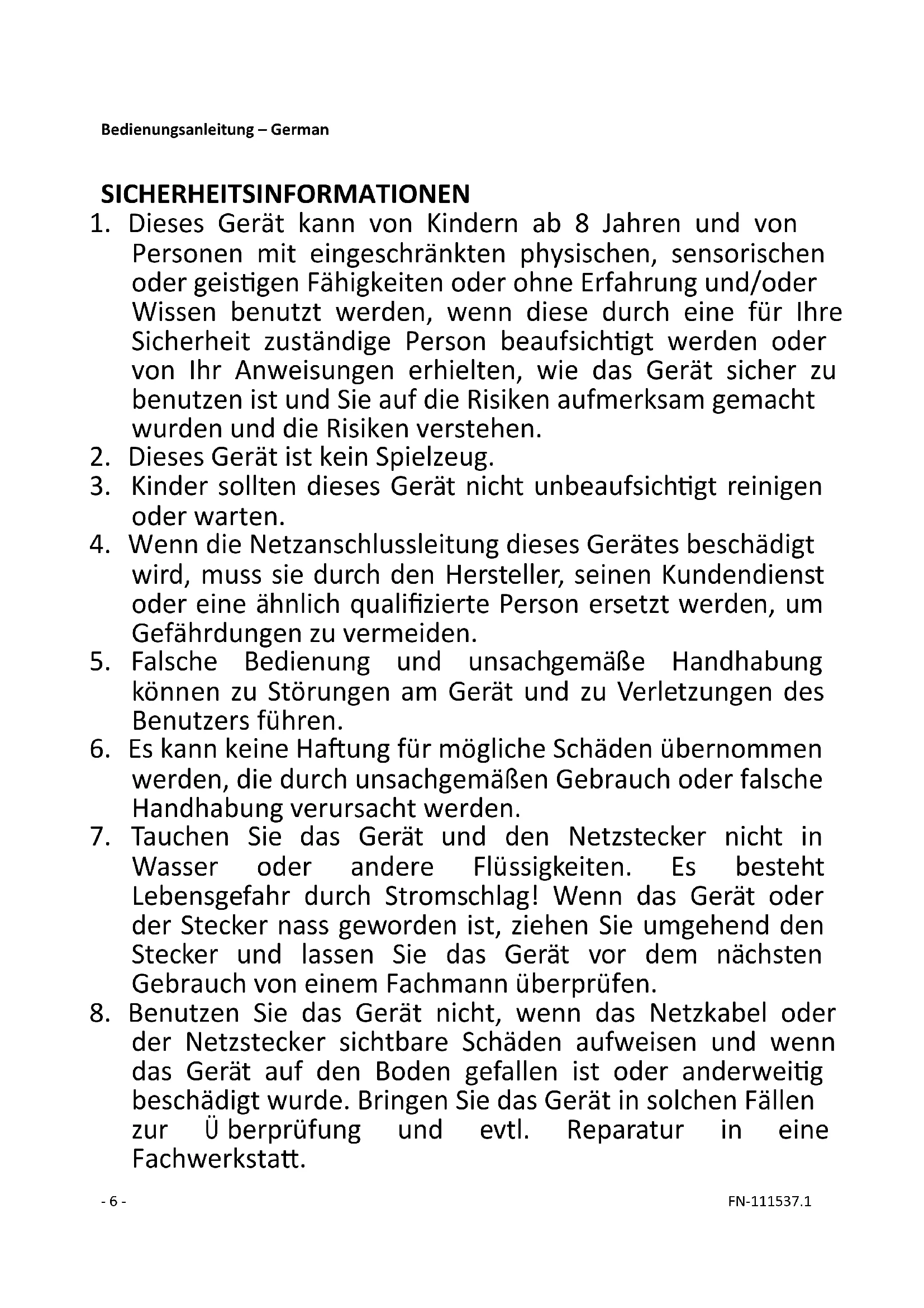 der Netzstecker sichtbare Schäden aufweisen und wenn das Gerät auf den Boden gefallen ist oder anderweitig beschädigt wurde. Bringen Sie das Gerät in solchen Fällen zur Ü berprüfung und evtl. Reparatur in eine Fachwerkstatt.- 7 - FN-111537.1