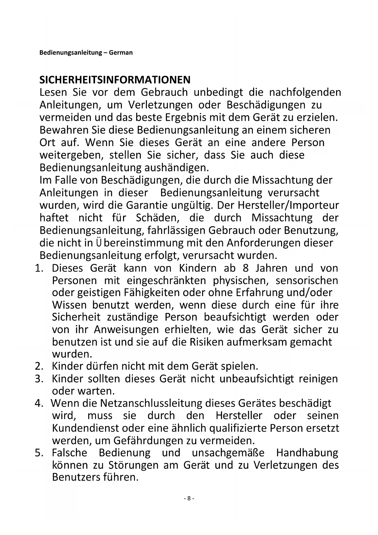 Regarding information for consumers on how to install, use and maintain the product, WEEE information, please check the instruction manual provided with packaging.- 8 - Bedienungsanleitung – German SICHERHEITSINFORMATIONEN Lesen Sie vor dem Gebrauch unbedingt die nachfolgenden Anleitungen, um Verletzungen oder Beschädigungen zu vermeiden und das beste Ergebnis mit dem Gerät zu erzielen. Bewahren Sie diese Bedienungsanleitung an einem sicheren Ort auf. Wenn Sie dieses Gerät an eine andere Person weitergeben, stellen Sie sicher, dass Sie auch diese Bedienungsanleitung aushändigen. Im Falle von Beschädigungen, die durch die Missachtung der Anleitungen in dieser Bedienungsanleitung verursacht wurden, wird die Garantie ungültig. Der Hersteller/Importeur haftet nicht für Schäden, die durch Missachtung der Bedienungsanleitung, fahrlässigen Gebrauch oder Benutzung, die nicht in Übereinstimmung mit den Anforderungen dieser Bedienungsanleitung erfolgt, verursacht wurden.