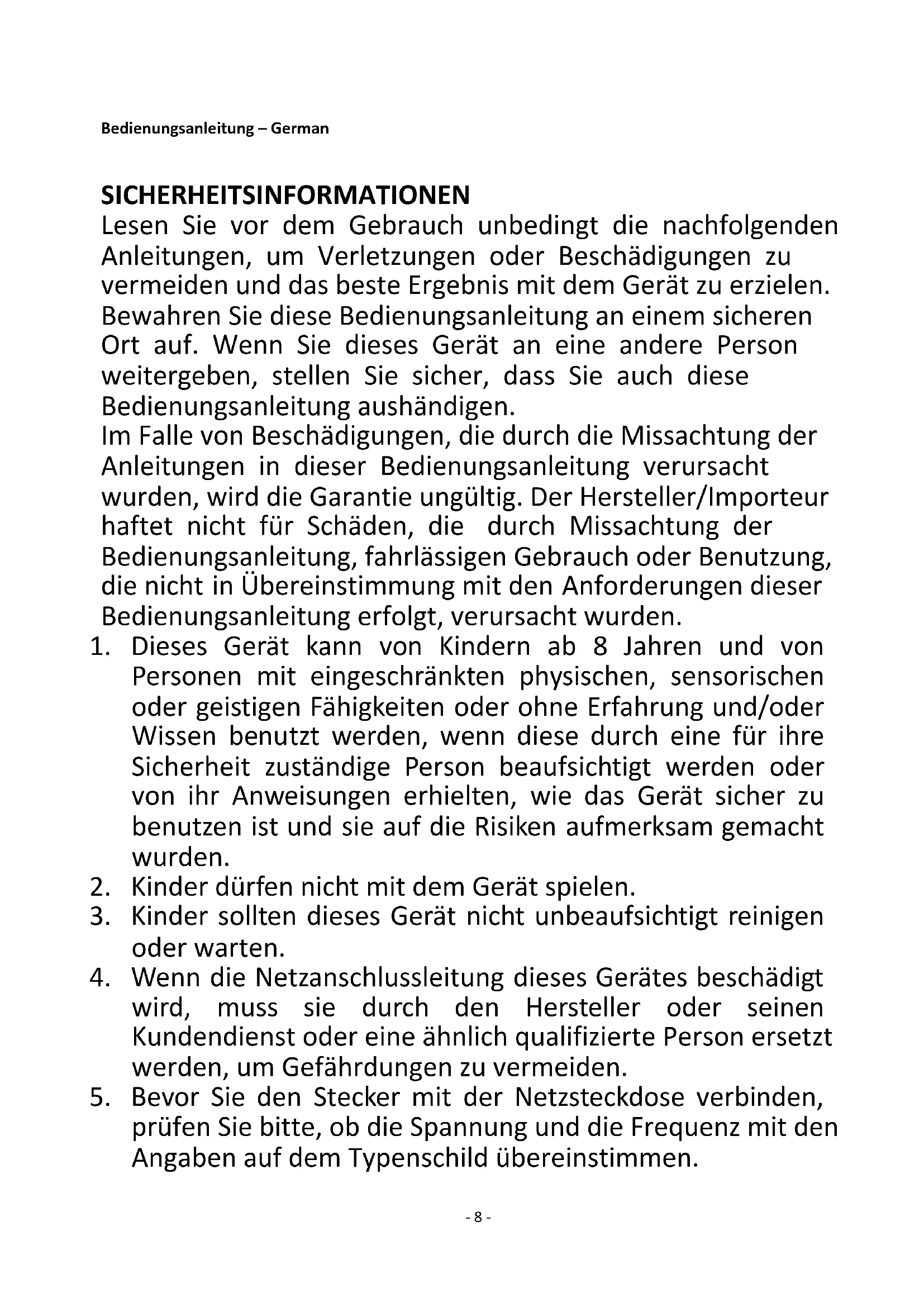 Regarding information for consumers on how to install, use and maintain the product, WEEE information, please check the instruction manual provided with packaging.- 8 - Bedienungsanleitung – German SICHERHEITSINFORMATIONEN Lesen Sie vor dem Gebrauch unbedingt die nachfolgenden Anleitungen, um Verletzungen oder Beschädigungen zu vermeiden und das beste Ergebnis mit dem Gerät zu erzielen. Bewahren Sie diese Bedienungsanleitung an einem sicheren Ort auf. Wenn Sie dieses Gerät an eine andere Person weitergeben, stellen Sie sicher, dass Sie auch diese Bedienungsanleitung aushändigen. Im Falle von Beschädigungen, die durch die Missachtung der Anleitungen in dieser Bedienungsanleitung verursacht wurden, wird die Garantie ungültig. Der Hersteller/Importeur haftet nicht für Schäden, die durch Missachtung der Bedienungsanleitung, fahrlässigen Gebrauch oder Benutzung, die nicht in Übereinstimmung mit den Anforderungen dieser Bedienungsanleitung erfolgt, verursacht wurden.