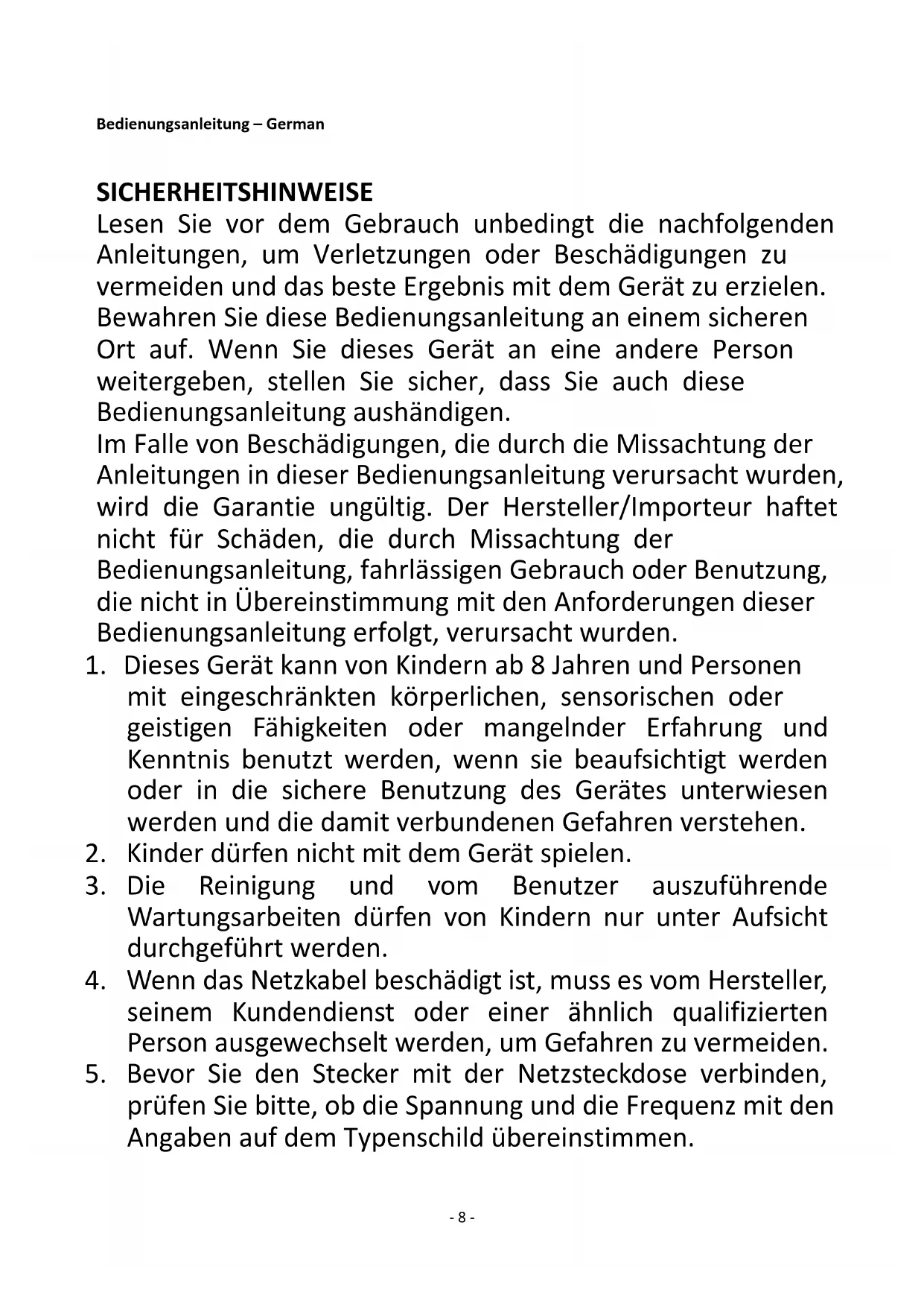1. Dieses Gerät kann von Kindern ab 8 Jahren und Personen