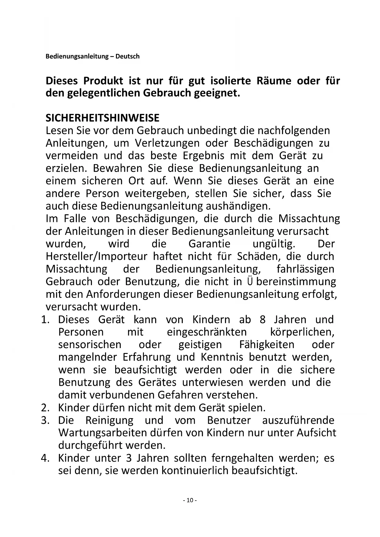 Satisfies the requirement of the Council Directives: COMMISSION REGULATION (EU) No 2015/1188 of 28 April 2015 and Amending COMMISSION REGULATION (EU) 2016/2282 implementing Directive 2009/125/EC of the European Parliament and of the Council with regard to ecodesign requirements for local space heaters Regarding information for consumers on how to install, use and maintain the product, WEEE information, please check the instruction manual provided with packaging.- 10 - Bedienungsanleitung – Deutsch Dieses Produkt ist nur für gut isolierte Räume oder für den gelegentlichen Gebrauch geeignet. SICHERHEITSHINWEISE Lesen Sie vor dem Gebrauch unbedingt die nachfolgenden Anleitungen, um Verletzungen oder Beschädigungen zu vermeiden und das beste Ergebnis mit dem Gerät zu erzielen. Bewahren Sie diese Bedienungsanleitung an einem sicheren Ort auf. Wenn Sie dieses Gerät an eine andere Person weitergeben, stellen Sie sicher, dass Sie auch diese Bedienungsanleitung aushändigen. Im Falle von Beschädigungen, die durch die Missachtung der Anleitungen in dieser Bedienungsanleitung verursacht wurden, wird die Garantie ungültig. Der Hersteller/Importeur haftet nicht für Schäden, die durch Missachtung der Bedienungsanleitung, fahrlässigen Gebrauch oder Benutzung, die nicht in Übereinstimmung mit den Anforderungen dieser Bedienungsanleitung erfolgt, verursacht wurden.
