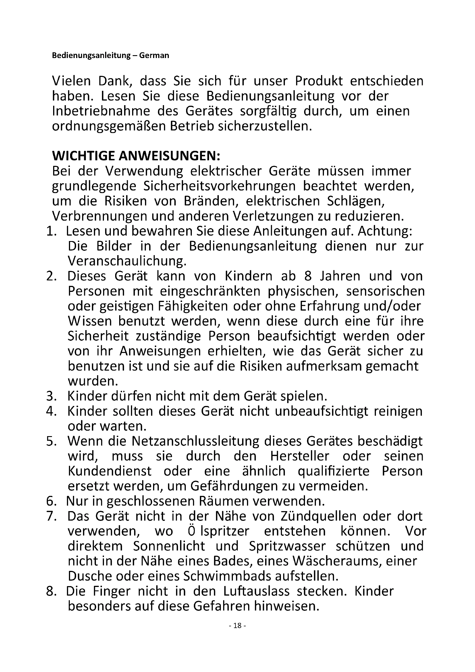 1. Lesen und bewahren Sie diese Anleitungen auf. Achtung: