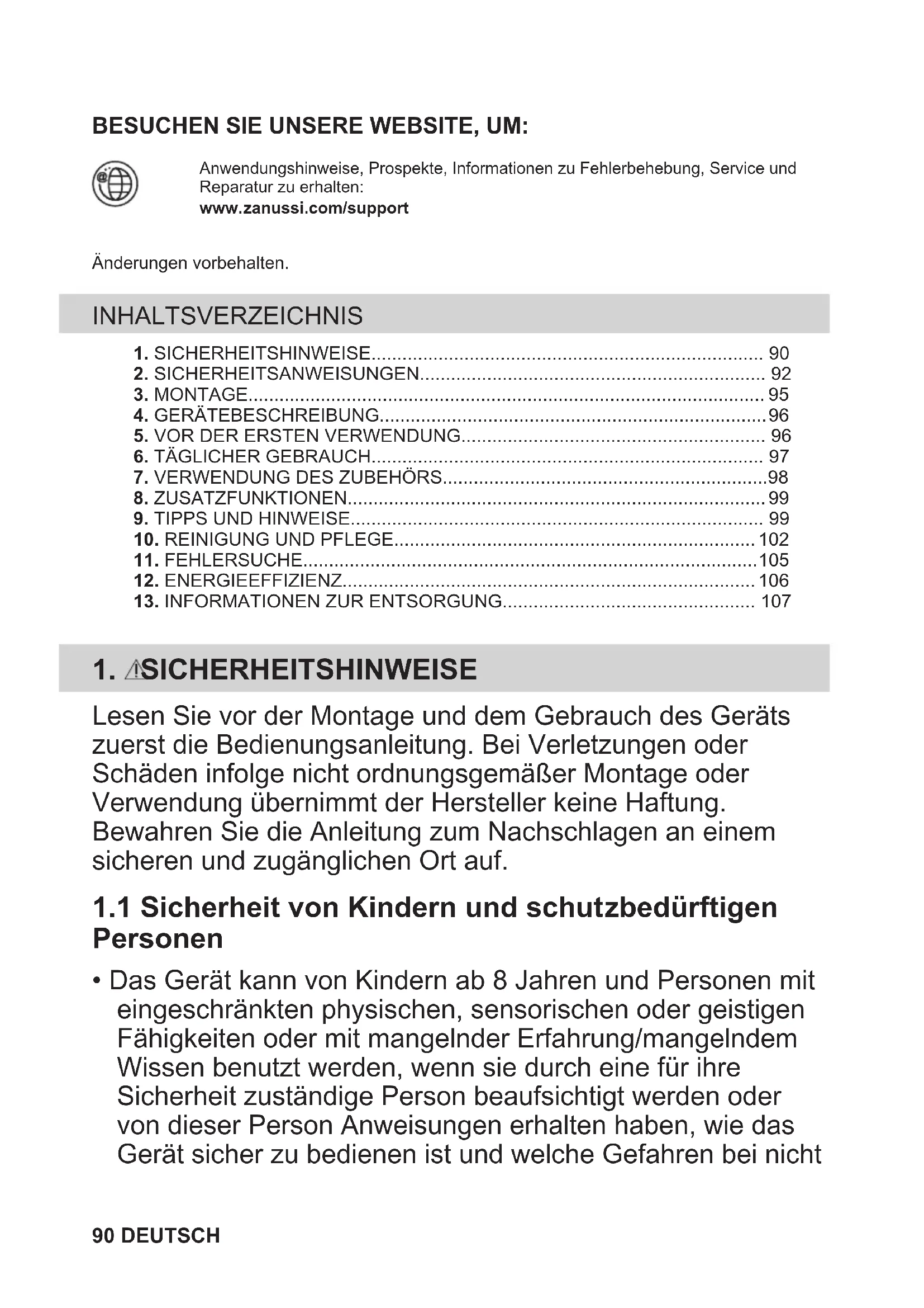 Ihre Pflichten als Endnutzer Dieses Elektro- bzw. Elektronikgerät ist mit einer durchgestrichenen Abfalltonne auf Rädern gekennzeichnet. Das Gerät darf deshalb nur getrennt vom unsortierten Siedlungsabfall gesammelt und zurückgenommen werden, es darf also nicht in den Hausmüll gegeben werden. Das Gerät kann z. B. bei einer kommunalen Sammelstelle oder ggf. bei einem Vertreiber (siehe zu deren Rücknahmepflichten unten) abgegeben werden. Das gilt auch für alle Bauteile, Unterbaugruppen und Verbrauchsmaterialien des zu entsorgenden Altgeräts. Bevor das Altgerät entsorgt werden darf, müssen alle Altbatterien und Altakkumulatoren vom Altgerät getrennt werden, die nicht vom Altgerät umschlossen sind. Das gleiche gilt für Lampen, die zerstörungsfrei aus dem Altgerät entnommen werden können. Der Endnutzer ist zudem selbst dafür verantwortlich, personenbezogene Daten auf dem Altgerät zu löschen. Hinweise zum Recycling Helfen Sie mit, alle Materialien zu recyceln, die mit diesem Symbol gekennzeichnet sind. Entsorgen Sie solche Materialien, insbesondere Verpackungen, nicht im Hausmüll sondern über die bereitgestellten Recyclingbehälter oder die entsprechenden örtlichen Sammelsysteme. Recyceln Sie zum Umwelt- und Gesundheitsschutz auch elektrische und elektronische Geräte. Rücknahmepflichten der Vertreiber in Deutschland Wer auf mindestens 400 m² Verkaufsfläche Elektro- und Elektronikgeräte vertreibt oder sonst geschäftlich an Endnutzer abgibt, ist verpflichtet, bei Abgabe eines neuen Geräts ein Altgerät des Endnutzers der gleichen Geräteart, das im Wesentlichen die gleichen Funktionen wie das neue Gerät erfüllt, am Ort der Abgabe oder in unmittelbarer Nähe hierzu unentgeltlich zurückzunehmen. Das gilt auch für Vertreiber von Lebensmitteln mit einer Gesamtverkaufsfläche von mindestens 800 m², die mehrmals im Kalenderjahr oder DEUTSCH 107dauerhaft Elektro- und Elektronikgeräte anbieten und auf dem Markt bereitstellen. Solche Vertreiber müssen zudem auf Verlangen des Endnutzers Altgeräte, die in keiner äußeren Abmessung größer als 25 cm sind (kleine Elektrogeräte), im Einzelhandelsgeschäft oder in unmittelbarer Nähe hierzu unentgeltlich zurückzunehmen; die Rücknahme darf in diesem Fall nicht an den Kauf eines Elektro- oder Elektronikgerätes geknüpft, kann aber auf drei Altgeräte pro Geräteart beschränkt werden. Ort der Abgabe ist auch der private Haushalt, wenn das neue Elektro- oder Elektronikgerät dorthin geliefert wird; in diesem Fall ist die Abholung des Altgerätes für den Endnutzer kostenlos. Die vorstehenden Pflichten gelten auch für den Vertrieb unter Verwendung von Fernkommunikationsmitteln, wenn die Vertreiber Lager- und Versandflächen für Elektro- und Elektronikgeräte bzw. Gesamtlager- und -versandflächen für Lebensmittel vorhalten, die den oben genannten Verkaufsflächen entsprechen. Die unentgeltliche Abholung von Elektro- und Elektronikgeräten ist dann aber auf Wärmeüberträger (z. B. Kühlschrank), Bildschirme, Monitore und Geräte, die Bildschirme mit einer Oberfläche von mehr als 100 cm² enthalten, und Geräte beschränkt, bei denen mindestens eine der äußeren Abmessungen mehr als 50 cm beträgt. Für alle übrigen Elektro- und Elektronikgeräte muss der Vertreiber geeignete Rückgabemöglichkeiten in zumutbarer Entfernung zum jeweiligen Endnutzer gewährleisten; das gilt auch für kleine Elektrogeräte (s.o.), die der Endnutzer zurückgeben will, ohne ein neues Gerät zu kaufen. Rücknahmepflichten von Vertreibern und andere Möglichkeiten der Entsorgung von Elektro- und Elektronikgeräten in der Region Wallonien Vertreiber, die Elektro- und Elektronikgeräte verkaufen, sind verpflichtet, bei der Lieferung von Neugeräten Altgeräte desselben Typs, die im Wesentlichen die gleichen Funktionen wie die Neugeräte erfüllen, kostenlos vom Endverbraucher zurückzunehmen. Dies gilt auch bei der Lieferung von neuen Elektro- und Elektronikgeräten oder beim Fernabsatz. Darüber hinaus ist jeder, der Elektro- und Elektronikgeräte auf einer Verkaufsfläche von mindestens 400 m² verkauft, verpflichtet, Altgeräte, die in keiner äußeren Abmessung größer als 25 cm sind (Elektrokleingeräte), im Ladengeschäft oder in unmittelbarer Nähe kostenlos zurückzunehmen; die Rücknahme darf in diesem Fall nicht vom Kauf eines Elektro- oder Elektronikgerätes abhängig gemacht werden. Die Rücknahme von Elektro- und Elektronikgeräten kann auch auf Containerplätzen oder zugelassenen Recyclinghöfen erfolgen. Für weitere Informationen wenden Sie sich bitte an Ihre Gemeindeverwaltung. 108 DEUTSCHGÅ INN PÅ NETTSIDEN VÅR FOR Å: Få råd om bruk, brosjyrer, hjelp til feilsøking, og informasjon om service ogreparasjon:www.zanussi.com/supportMed forbehold om endringer. INNHOLD