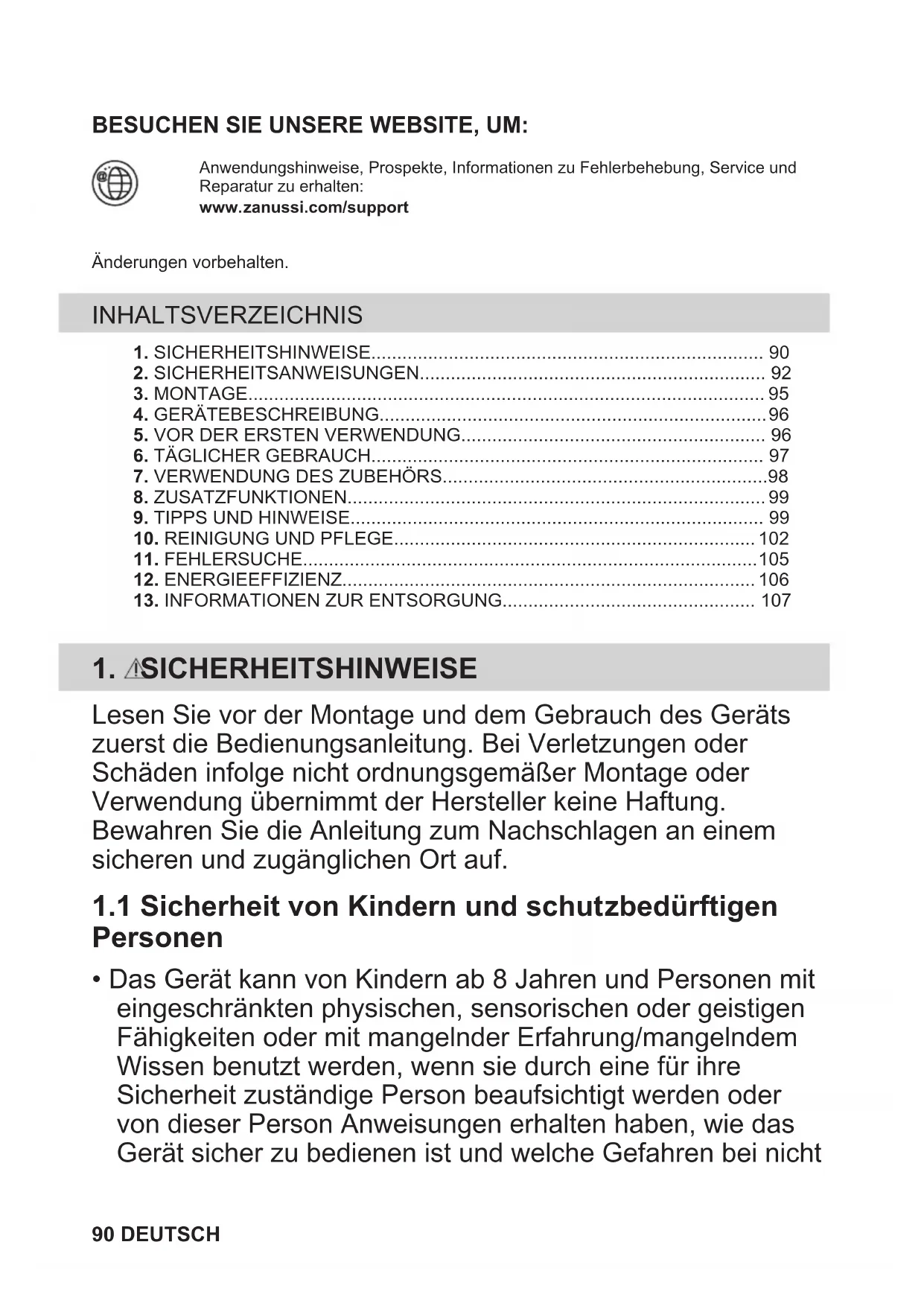Ihre Pflichten als Endnutzer Dieses Elektro- bzw. Elektronikgerät ist mit einer durchgestrichenen Abfalltonne auf Rädern gekennzeichnet. Das Gerät darf deshalb nur getrennt vom unsortierten Siedlungsabfall gesammelt und zurückgenommen werden, es darf also nicht in den Hausmüll gegeben werden. Das Gerät kann z. B. bei einer kommunalen Sammelstelle oder ggf. bei einem Vertreiber (siehe zu deren Rücknahmepflichten unten) abgegeben werden. Das gilt auch für alle Bauteile, Unterbaugruppen und Verbrauchsmaterialien des zu entsorgenden Altgeräts. Bevor das Altgerät entsorgt werden darf, müssen alle Altbatterien und Altakkumulatoren vom Altgerät getrennt werden, die nicht vom Altgerät umschlossen sind. Das gleiche gilt für Lampen, die zerstörungsfrei aus dem Altgerät entnommen werden können. Der Endnutzer ist zudem selbst dafür verantwortlich, personenbezogene Daten auf dem Altgerät zu löschen. Hinweise zum Recycling Helfen Sie mit, alle Materialien zu recyceln, die mit diesem Symbol gekennzeichnet sind. Entsorgen Sie solche Materialien, insbesondere Verpackungen, nicht im Hausmüll sondern über die bereitgestellten Recyclingbehälter oder die entsprechenden örtlichen Sammelsysteme. Recyceln Sie zum Umwelt- und Gesundheitsschutz auch elektrische und elektronische Geräte. Rücknahmepflichten der Vertreiber in Deutschland Wer auf mindestens 400 m² Verkaufsfläche Elektro- und Elektronikgeräte vertreibt oder sonst geschäftlich an Endnutzer abgibt, ist verpflichtet, bei Abgabe eines neuen Geräts ein Altgerät des Endnutzers der gleichen Geräteart, das im Wesentlichen die gleichen Funktionen wie das neue Gerät erfüllt, am Ort der Abgabe oder in unmittelbarer Nähe hierzu unentgeltlich zurückzunehmen. Das gilt auch für Vertreiber von Lebensmitteln mit einer Gesamtverkaufsfläche von mindestens 800 m², die mehrmals im Kalenderjahr oder DEUTSCH 107dauerhaft Elektro- und Elektronikgeräte anbieten und auf dem Markt bereitstellen. Solche Vertreiber müssen zudem auf Verlangen des Endnutzers Altgeräte, die in keiner äußeren Abmessung größer als 25 cm sind (kleine Elektrogeräte), im Einzelhandelsgeschäft oder in unmittelbarer Nähe hierzu unentgeltlich zurückzunehmen; die Rücknahme darf in diesem Fall nicht an den Kauf eines Elektro- oder Elektronikgerätes geknüpft, kann aber auf drei Altgeräte pro Geräteart beschränkt werden. Ort der Abgabe ist auch der private Haushalt, wenn das neue Elektro- oder Elektronikgerät dorthin geliefert wird; in diesem Fall ist die Abholung des Altgerätes für den Endnutzer kostenlos. Die vorstehenden Pflichten gelten auch für den Vertrieb unter Verwendung von Fernkommunikationsmitteln, wenn die Vertreiber Lager- und Versandflächen für Elektro- und Elektronikgeräte bzw. Gesamtlager- und -versandflächen für Lebensmittel vorhalten, die den oben genannten Verkaufsflächen entsprechen. Die unentgeltliche Abholung von Elektro- und Elektronikgeräten ist dann aber auf Wärmeüberträger (z. B. Kühlschrank), Bildschirme, Monitore und Geräte, die Bildschirme mit einer Oberfläche von mehr als 100 cm² enthalten, und Geräte beschränkt, bei denen mindestens eine der äußeren Abmessungen mehr als 50 cm beträgt. Für alle übrigen Elektro- und Elektronikgeräte muss der Vertreiber geeignete Rückgabemöglichkeiten in zumutbarer Entfernung zum jeweiligen Endnutzer gewährleisten; das gilt auch für kleine Elektrogeräte (s.o.), die der Endnutzer zurückgeben will, ohne ein neues Gerät zu kaufen. Rücknahmepflichten von Vertreibern und andere Möglichkeiten der Entsorgung von Elektro- und Elektronikgeräten in der Region Wallonien Vertreiber, die Elektro- und Elektronikgeräte verkaufen, sind verpflichtet, bei der Lieferung von Neugeräten Altgeräte desselben Typs, die im Wesentlichen die gleichen Funktionen wie die Neugeräte erfüllen, kostenlos vom Endverbraucher zurückzunehmen. Dies gilt auch bei der Lieferung von neuen Elektro- und Elektronikgeräten oder beim Fernabsatz. Darüber hinaus ist jeder, der Elektro- und Elektronikgeräte auf einer Verkaufsfläche von mindestens 400 m² verkauft, verpflichtet, Altgeräte, die in keiner äußeren Abmessung größer als 25 cm sind (Elektrokleingeräte), im Ladengeschäft oder in unmittelbarer Nähe kostenlos zurückzunehmen; die Rücknahme darf in diesem Fall nicht vom Kauf eines Elektro- oder Elektronikgerätes abhängig gemacht werden. Die Rücknahme von Elektro- und Elektronikgeräten kann auch auf Containerplätzen oder zugelassenen Recyclinghöfen erfolgen. Für weitere Informationen wenden Sie sich bitte an Ihre Gemeindeverwaltung. 108 DEUTSCHGÅ INN PÅ NETTSIDEN VÅR FOR Å: Få råd om bruk, brosjyrer, hjelp til feilsøking, og informasjon om service ogreparasjon:www.zanussi.com/supportMed forbehold om endringer. INNHOLD