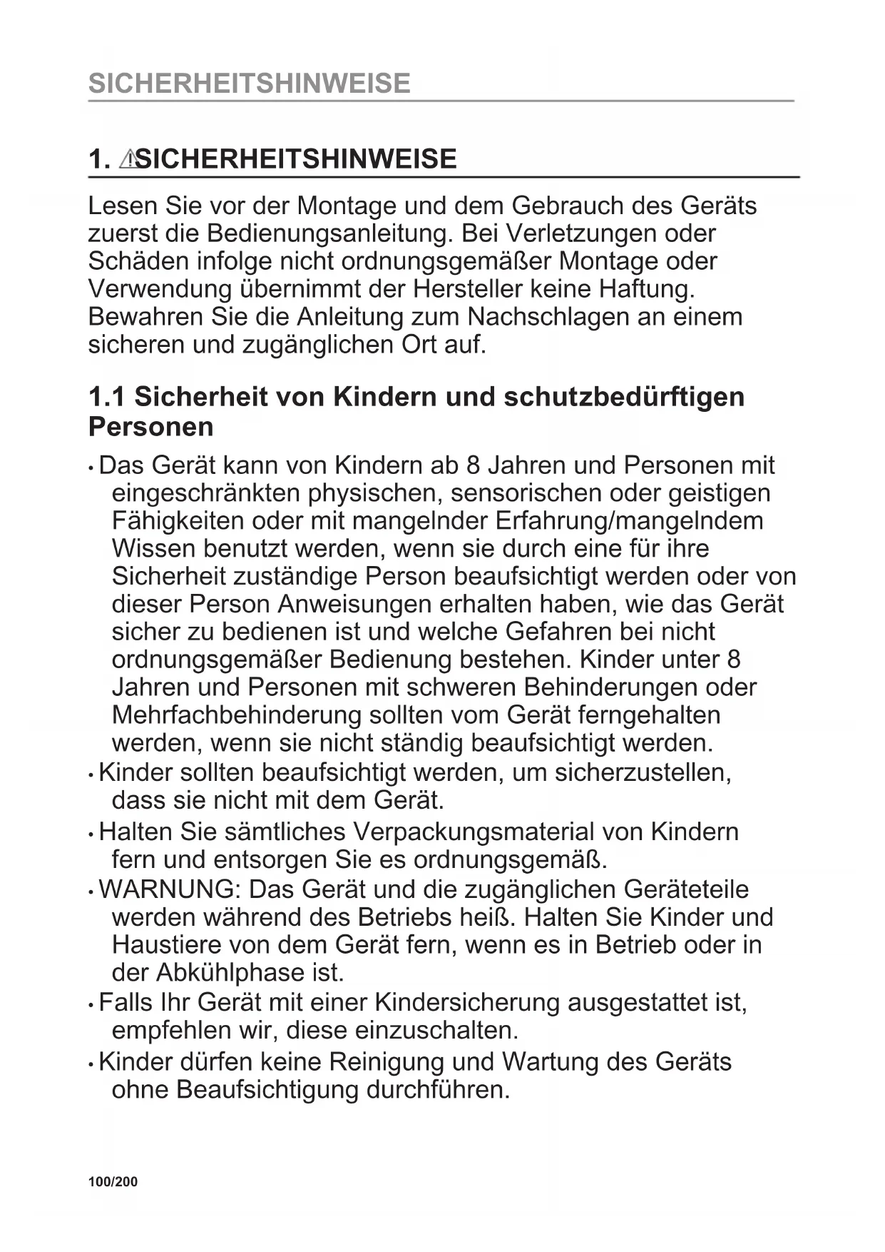 - Kinder dürfen keine Reinigung und Wartung des Geräts ohne Beaufsichtigung durchführen. 100/200 SICHERHEITSHINWEISE1.2 Allgemeine Sicherheit