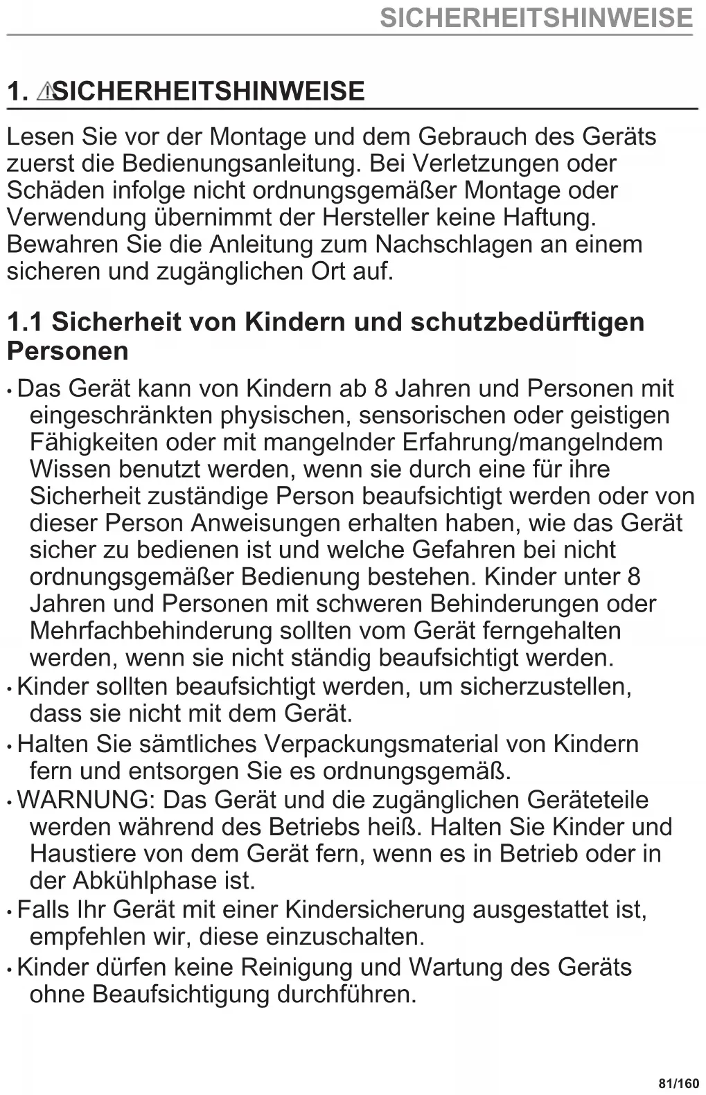 - Kinder dürfen keine Reinigung und Wartung des Geräts ohne Beaufsichtigung durchführen. 81/160 SICHERHEITSHINWEISE1.2 Allgemeine Sicherheit