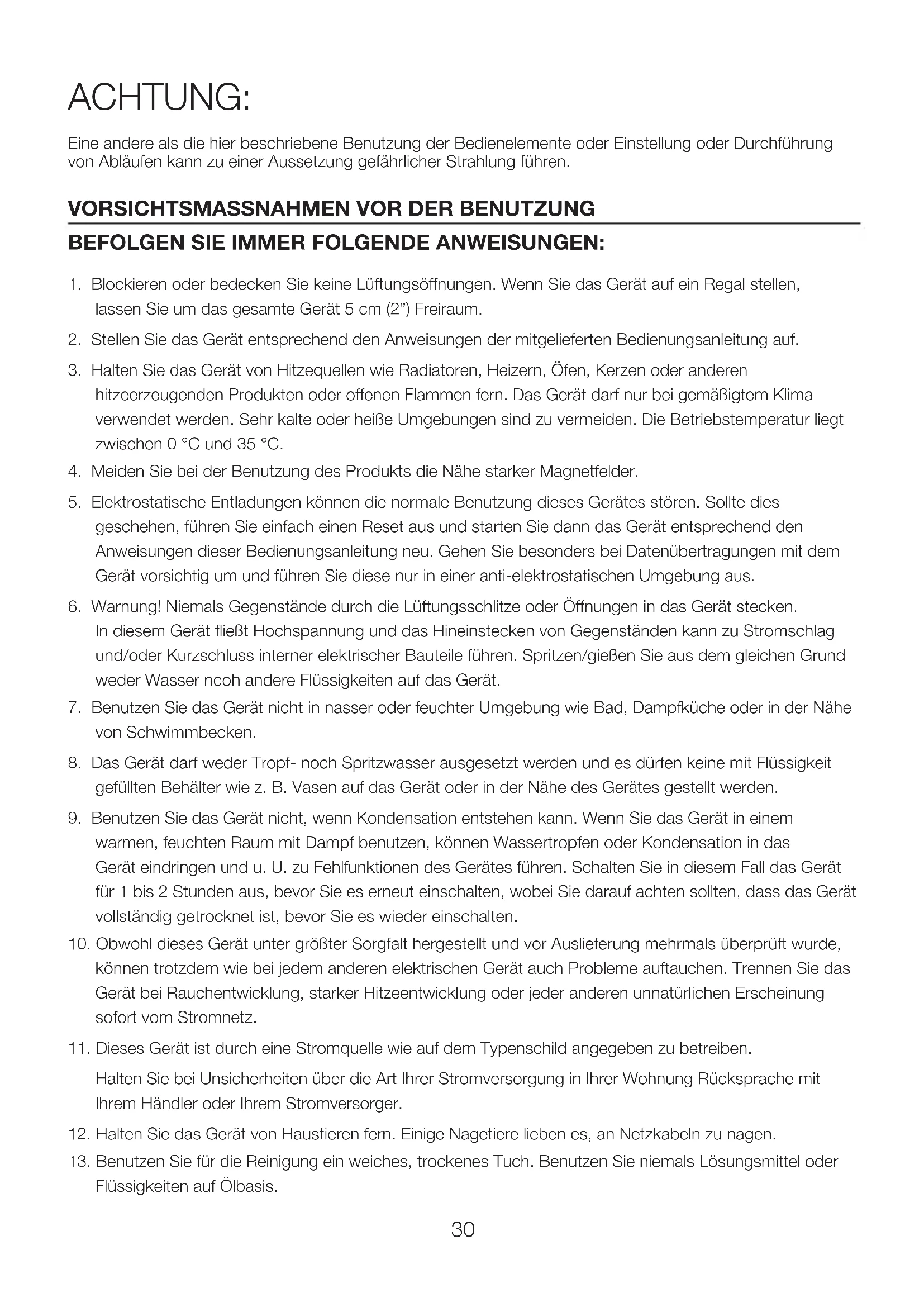 8. Das Gerät darf weder Tropf- noch Spritzwasser ausgesetzt werden und es dürfen keine mit Flüssigkeit