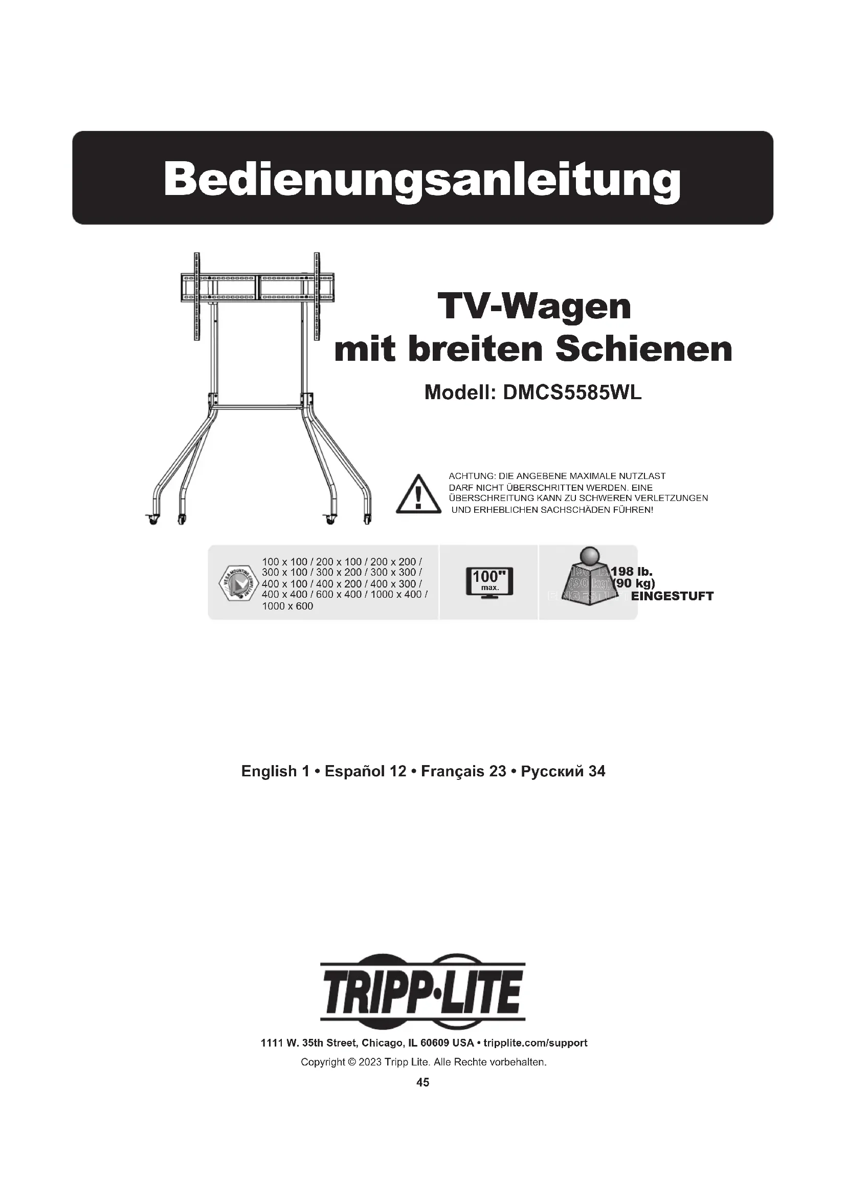 - При возникновении любых дополнительных вопросов посетите страницу tripplite.com/support. M-J44 1111 W. 35th Street, Chicago, IL 60609 USA • tripplite.com/support 22-08-036 934149_RevA45 Bedienungsanleitung TV-Wagen mit breiten Schienen Modell: DMCS5585WL 1111 W. 35th Street, Chicago, IL 60609 USA • tripplite.com/supportCopyright © 2023 Tripp Lite. Alle Rechte vorbehalten.ACHTUNG: DIE ANGEBENE MAXIMALE NUTZLAST DARF NICHT ÜBERSCHRITTEN WERDEN. EINE ÜBERSCHREITUNG KANN ZU SCHWEREN VERLETZUNGEN UND ERHEBLICHEN SACHSCHÄDEN FÜHREN!100 x 100 / 200 x 100 / 200 x 200 / 300 x 100 / 300 x 200 / 300 x 300 / 400 x 100 / 400 x 200 / 400 x 300 / 400 x 400 / 600 x 400 / 1000 x 400 / 1000 x 600 100" max. 198 lb.198 lb. (90 kg)(90 kg) EINGESTUFTEINGESTUFT English 1 • Español 12 • Français 23 • Русский 3446 Sicherheitshinweise Garantie WARNUNG HINWEIS: Lesen Sie das gesamte Handbuch, bevor Sie mit der Installation und Montage beginnen.