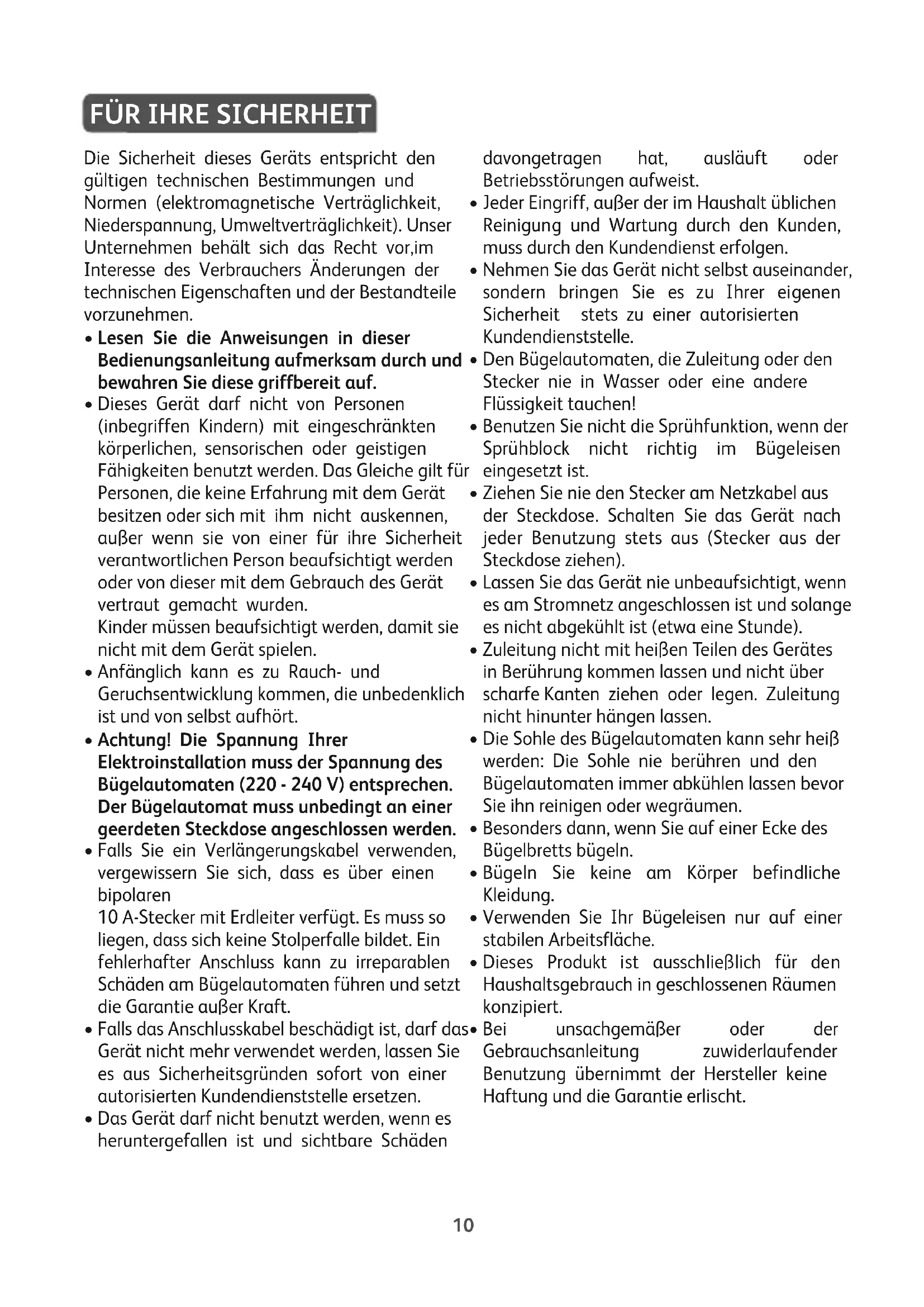 - Den Bügelautomaten, die Zuleitung oder den Stecker nie in Wasser oder eine andere Flüssigkeit tauchen!