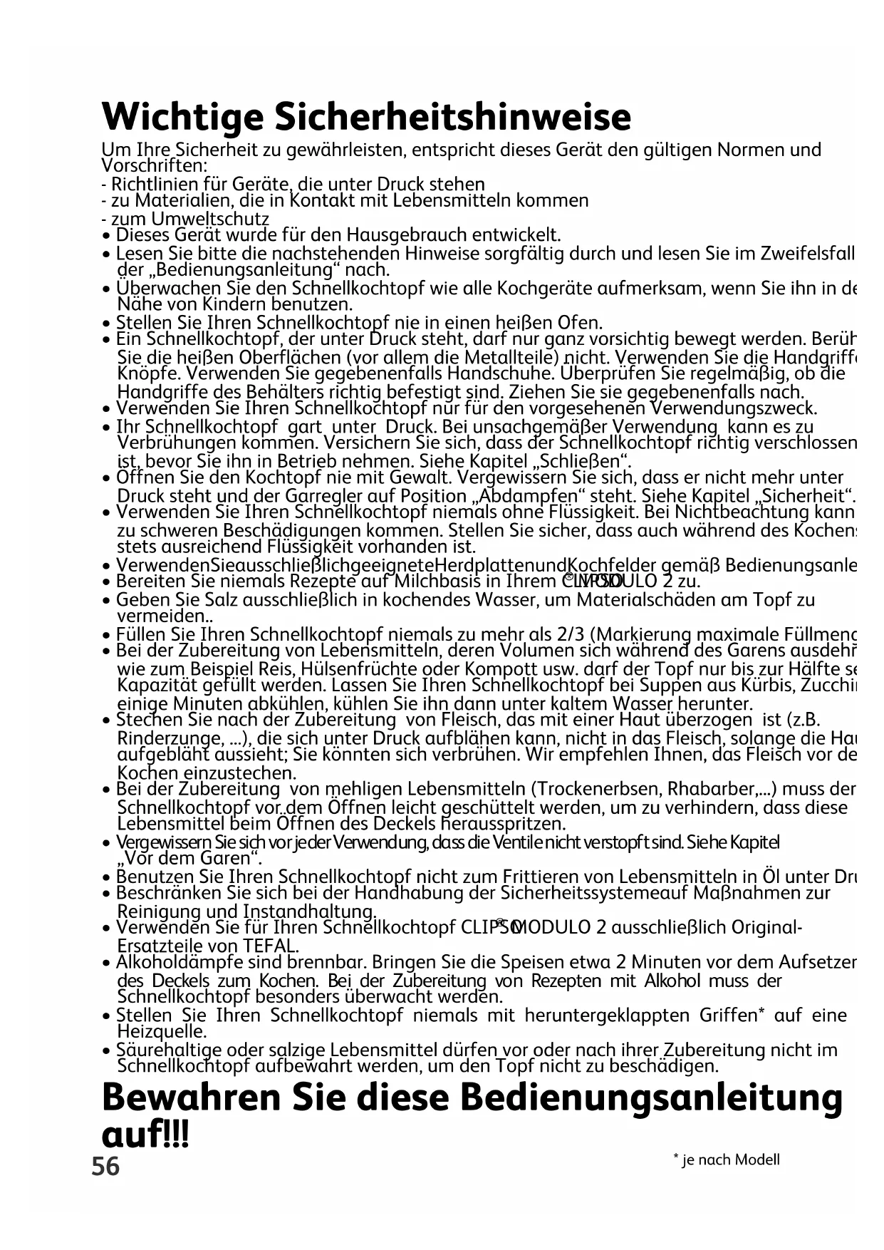- je nach Modell Wichtige Sicherheitshinweise Um Ihre Sicherheit zu gewährleisten, entspricht dieses Gerät den gültigen Normen und Vorschriften: - Richtlinien für Geräte, die unter Druck stehen - zu Materialien, die in Kontakt mit Lebensmitteln kommen - zum Umweltschutz