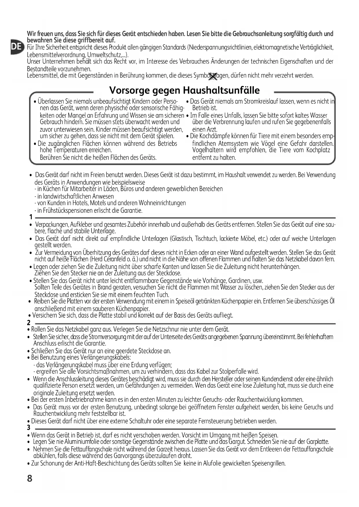 - Zur Schonung der Anti-Haft-Beschichtung des Geräts sollten Sie keine in Alufolie gewickelten Speisengrillen. Wir freuen uns, dass Sie sich für dieses Gerät entschieden haben. Lesen Sie bitte die Gebrauchsanleitung sorgfältig durch und bewahren Sie diese griffbereit auf. Für Ihre Sicherheit entspricht dieses Produkt allen gängigen Standards (Niederspannungsrichtlinien, elektromagnetische Verträglichkeit, Lebensmittelverordnung, Umweltschutz,...). Unser Unternehmen behält sich das Recht vor, im Interesse des Verbrauchers Änderungen der technischen Eigenschaften und der Bestandteile vorzunehmen. Lebensmittel, die mit Gegenständen in Berührung kommen, die dieses Symbol tragen, dürfen nicht mehr verzehrt werden.