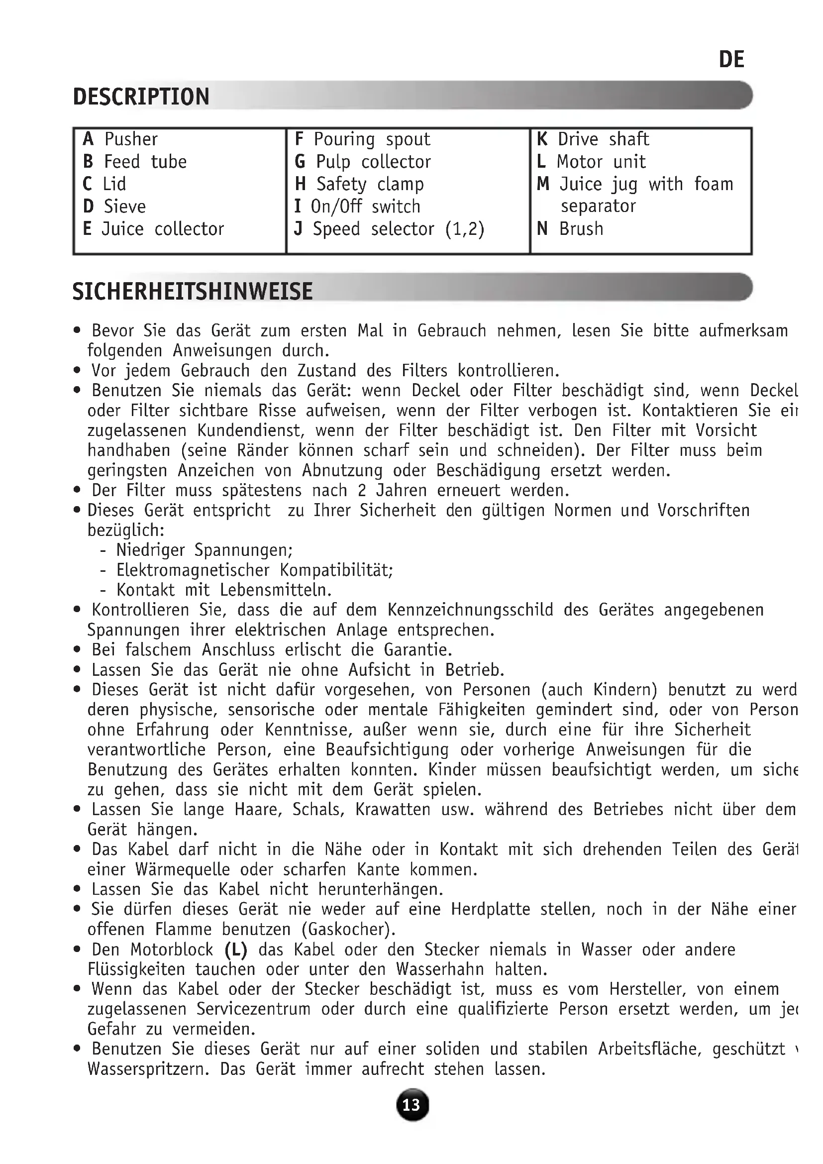 - Benutzen Sie immer nur die mit dem Entsafter mitgelieferten Zubehörteile. Bei Nicht- Beachtung dieser Regel übernimmt der Hersteller keine Verantwortung.