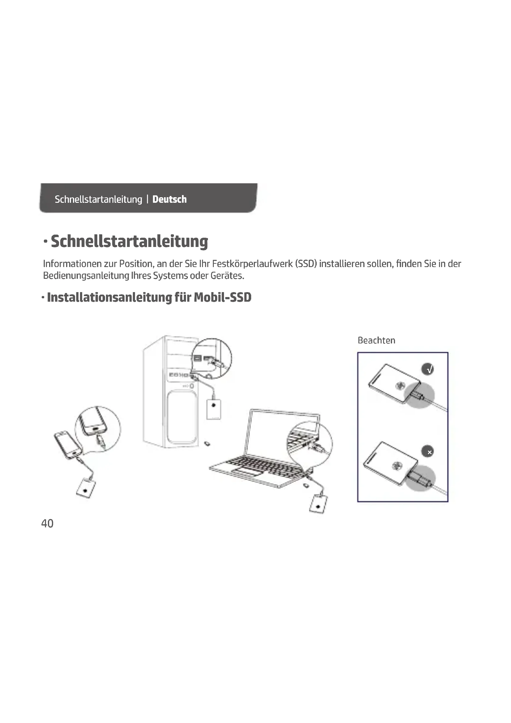 - Installationsanleitung für Mobil-SSD Informationen zur Position, an der Sie Ihr Festkörperlaufwerk (SSD) installieren sollen, nden Sie in der Bedienungsanleitung Ihres Systems oder Gerätes. Schnellstartanleitung | Deutsch Portable SSD P700