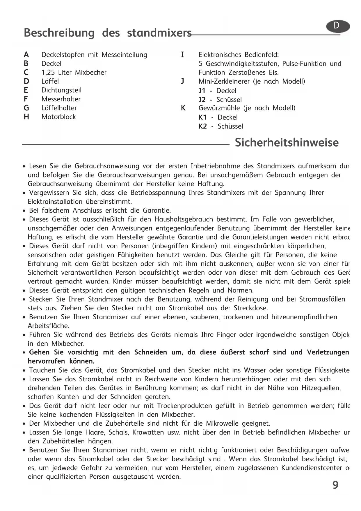 - Lesen Sie die Gebrauchsanweisung vor der ersten Inbetriebnahme des Standmixers aufmerksam durch und befolgen Sie die Gebrauchsanweisungen genau. Bei unsachgemäßem Gebrauch entgegen der Gebrauchsanweisung übernimmt der Hersteller keine Haftung.