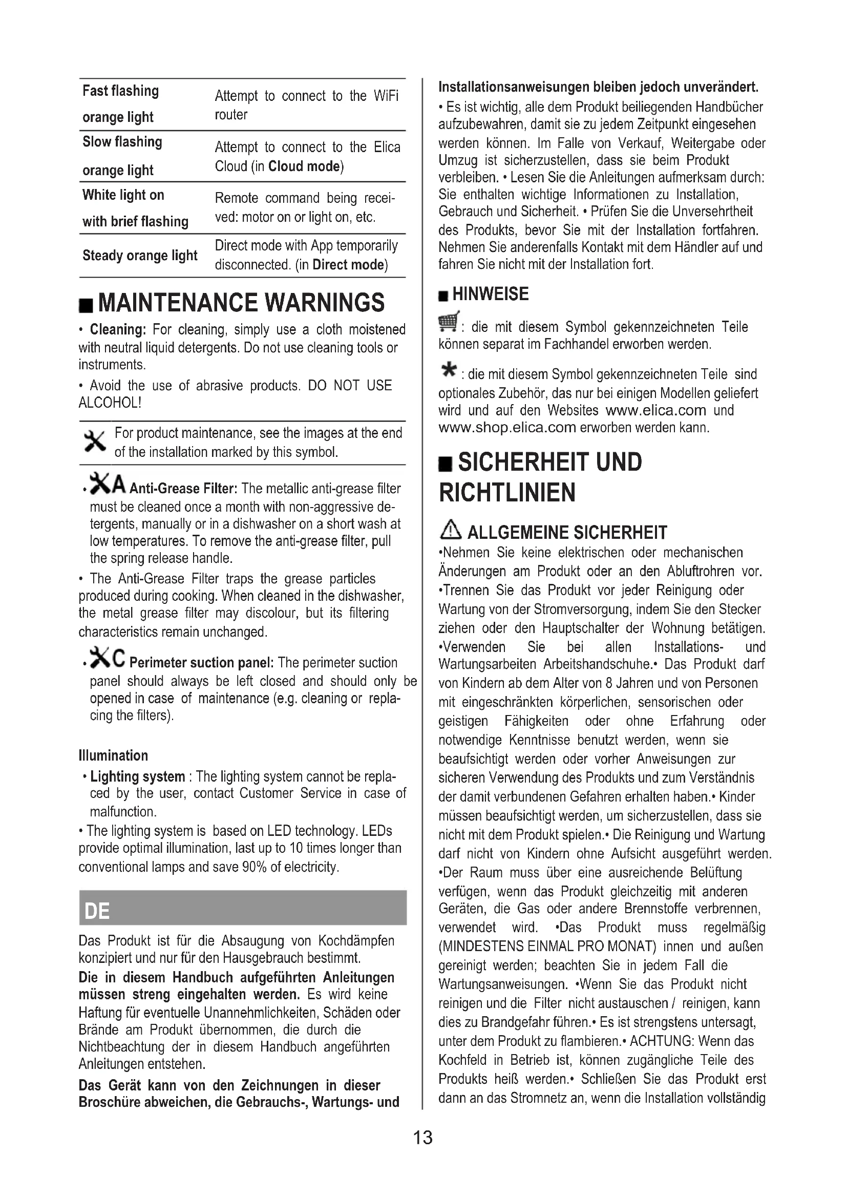 - Modalität Direct Control Diese Funktionalität ermöglicht es, das Produkt über ein Handy wie eine Funksteuerung zu steuern. ● Konfiguration WLAN: Befolgen Sie die Anweisungen in der App Elica Connect für die WLAN-Konfiguration. Während des Konfigurationsverfahrens leuchtet die LED L2 der Abzugshaube auf und zeigt den Zustand der Konnektivität an (siehe Tabelle WLAN-Verbindungszustand unten). Um das WLAN-Konfigurationsverfahren zu unterbrechen, für ungefähr 2 s die Taste A der Funksteuerung drücken, wenn die LED L2 der Abzugshaube mit schnell pulsierendem Licht eingeschaltet ist. ● Reset WLAN-Konfiguration: Dieser Vorgang dient dazu, das Produkt in seine Werkskonfiguration zurückzubringen. Mit Funksteuerung 1: für 2 s die Tasten A+B drücken. Mit Funksteuerung 2: für 2 s die Tasten D+E drücken. Anmerkung: Das Passwort und alle anderen in der App Elica Connect ausgeführten Einstellungen werden zurückgesetzt und es ist notwendig, sie erneut einzustellen. ● Einschalten/Ausschalten des WLAN: Nachdem die Konfiguration ausgeführt wurde, ist es möglich, das WLAN ein- oder auszuschalten. Mit Funksteuerung 1: Für 2 s die Taste A drücken. Mit Funksteuerung 2: Dieses Verfahren wird im Handbuch der Funksteuerung beschrieben. Anmerkung: Das Ausschalten des WLAN mit diesem Verfahren führt nicht zum Verlust der vorher gespeicherten Parameter. TABELLE WLAN-ZUSTAND LED L2 WLAN-Zustand Licht ausgeschaltet WLAN nicht konfiguriert oder nicht verbunden Weißes festes Licht eingeschaltet WLAN verbunden Orangefarbenes sch- nell pulsierendes Licht Verbindungsversuch mit dem WLAN-Router Orangefarbenes lang- sam pulsierendes Licht Verbindungsversuch mit der Cloud Elica (in Modalität Cloud) Weißes eingeschalte- tes Licht mit kurz pulsieren- dem Licht Empfang eines Fernbefehls: Ein- schalten des Motors oder der Be- leuchtung usw. Orangefarbenes fe- stes Licht Modalität Direct mit App vorüber- gehend unterbrochen. (in Modali- tät Direct) WARNHINWEISE ZUR WARTUNG
