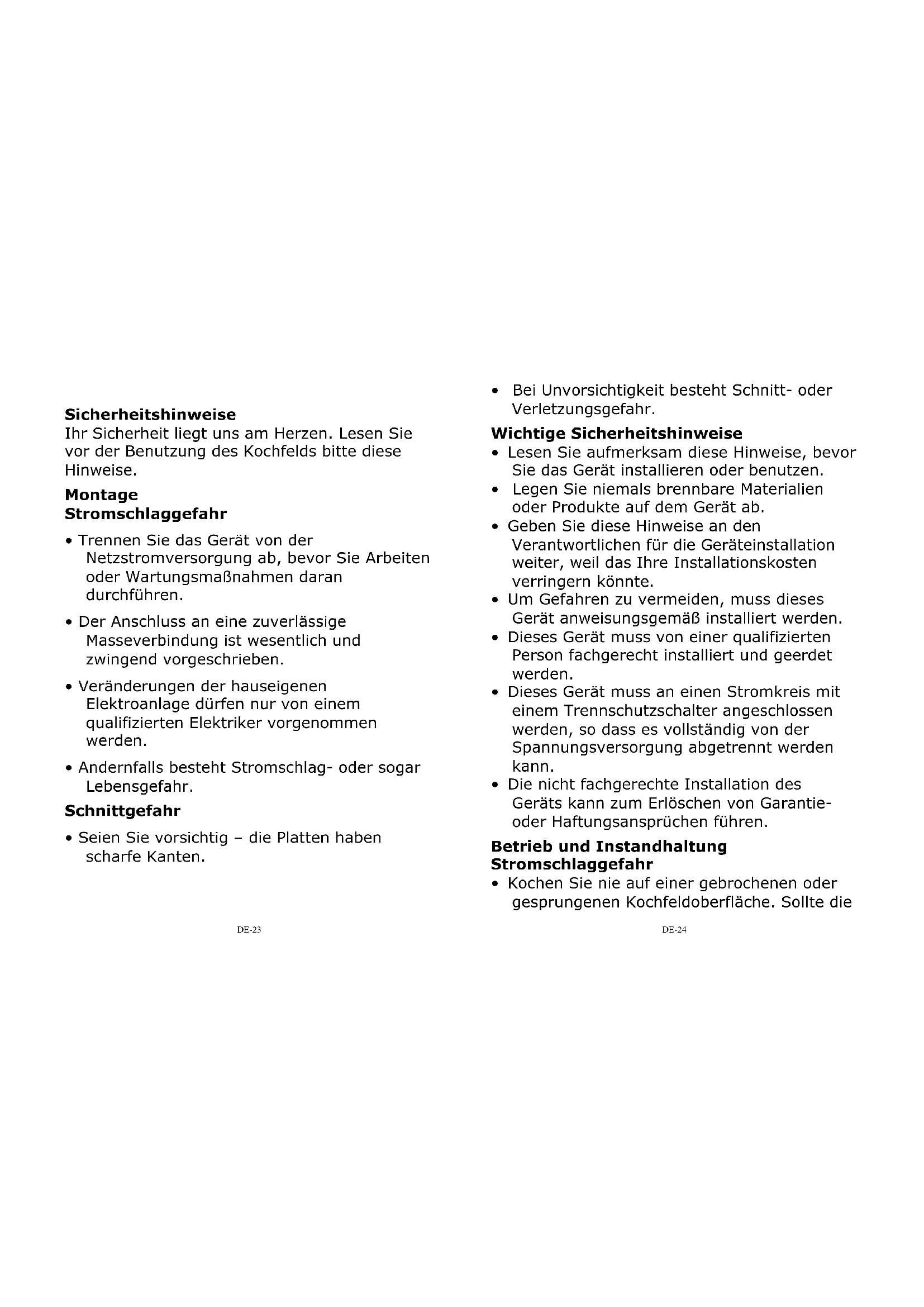 Sicherheitshinweise Ihr Sicherheit liegt uns am Herzen. Lesen Sie vor der Benutzung des Kochfelds bitte diese Hinweise. Montage Stromschlaggefahr