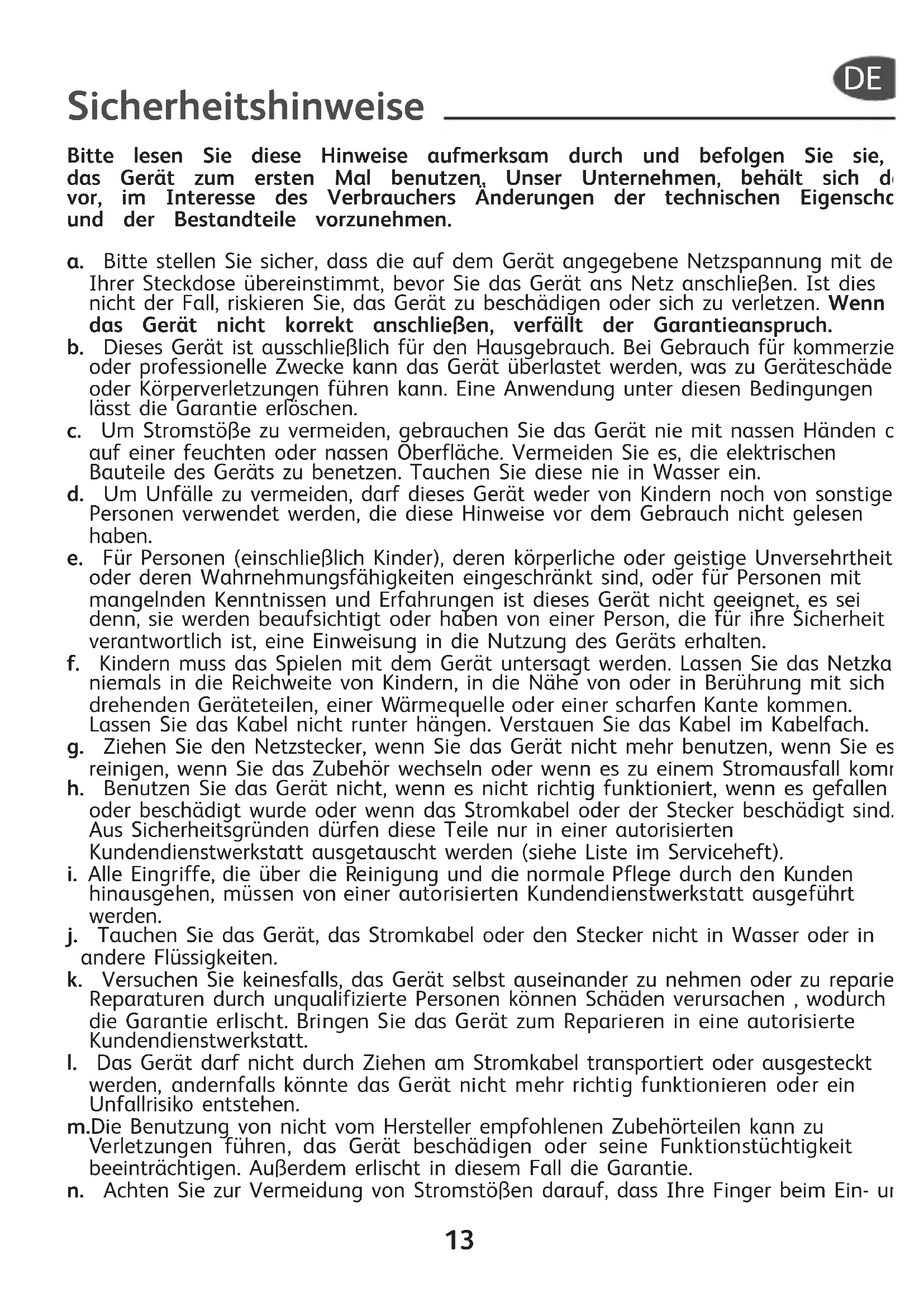 Storage Use the cord storage base for neater storage (fig. 2). End-Of-Life Electrical or Electronic Products Environmental protection first! Your appliance contains valuable materials which can be recovered or recycled. Leave it at a local civic waste collection point. HELPLINE: If you have any product problems or queries, please contact our Customer Relations Team first for expert help and advice: 0845 602 1454 – UK (01) 677 4003 – ROI or consult our website – www.tefal.co.uk13 Sicherheitshinweise Bitte lesen Sie diese Hinweise aufmerksam durch und befolgen Sie sie, bevor Sie das Gerät zum ersten Mal benutzen. Unser Unternehmen, behält sich das Recht vor, im Interesse des Verbrauchers Änderungen der technischen Eigenschaften und der Bestandteile vorzunehmen. a. Bitte stellen Sie sicher, dass die auf dem Gerät angegebene Netzspannung mit der Ihrer Steckdose übereinstimmt, bevor Sie das Gerät ans Netz anschließen. Ist dies nicht der Fall, riskieren Sie, das Gerät zu beschädigen oder sich zu verletzen. Wenn Sie das Gerät nicht korrekt anschließen, verfällt der Garantieanspruch. b. Dieses Gerät ist ausschließlich für den Hausgebrauch. Bei Gebrauch für kommerzielle oder professionelle Zwecke kann das Gerät überlastet werden, was zu Geräteschäden oder Körperverletzungen führen kann. Eine Anwendung unter diesen Bedingungen lässt die Garantie erlöschen. c. Um Stromstöße zu vermeiden, gebrauchen Sie das Gerät nie mit nassen Händen oder auf einer feuchten oder nassen Oberfläche. Vermeiden Sie es, die elektrischen Bauteile des Geräts zu benetzen. Tauchen Sie diese nie in Wasser ein. d. Um Unfälle zu vermeiden, darf dieses Gerät weder von Kindern noch von sonstigen Personen verwendet werden, die diese Hinweise vor dem Gebrauch nicht gelesen haben. e. Für Personen (einschließlich Kinder), deren körperliche oder geistige Unversehrtheit oder deren Wahrnehmungsfähigkeiten eingeschränkt sind, oder für Personen mit mangelnden Kenntnissen und Erfahrungen ist dieses Gerät nicht geeignet, es sei denn, sie werden beaufsichtigt oder haben von einer Person, die für ihre Sicherheit verantwortlich ist, eine Einweisung in die Nutzung des Geräts erhalten. f. Kindern muss das Spielen mit dem Gerät untersagt werden. Lassen Sie das Netzkabel niemals in die Reichweite von Kindern, in die Nähe von oder in Berührung mit sich drehenden Geräteteilen, einer Wärmequelle oder einer scharfen Kante kommen. Lassen Sie das Kabel nicht runter hängen. Verstauen Sie das Kabel im Kabelfach. g. Ziehen Sie den Netzstecker, wenn Sie das Gerät nicht mehr benutzen, wenn Sie es reinigen, wenn Sie das Zubehör wechseln oder wenn es zu einem Stromausfall kommt. h. Benutzen Sie das Gerät nicht, wenn es nicht richtig funktioniert, wenn es gefallen ist oder beschädigt wurde oder wenn das Stromkabel oder der Stecker beschädigt sind. Aus Sicherheitsgründen dürfen diese Teile nur in einer autorisierten Kundendienstwerkstatt ausgetauscht werden (siehe Liste im Serviceheft).