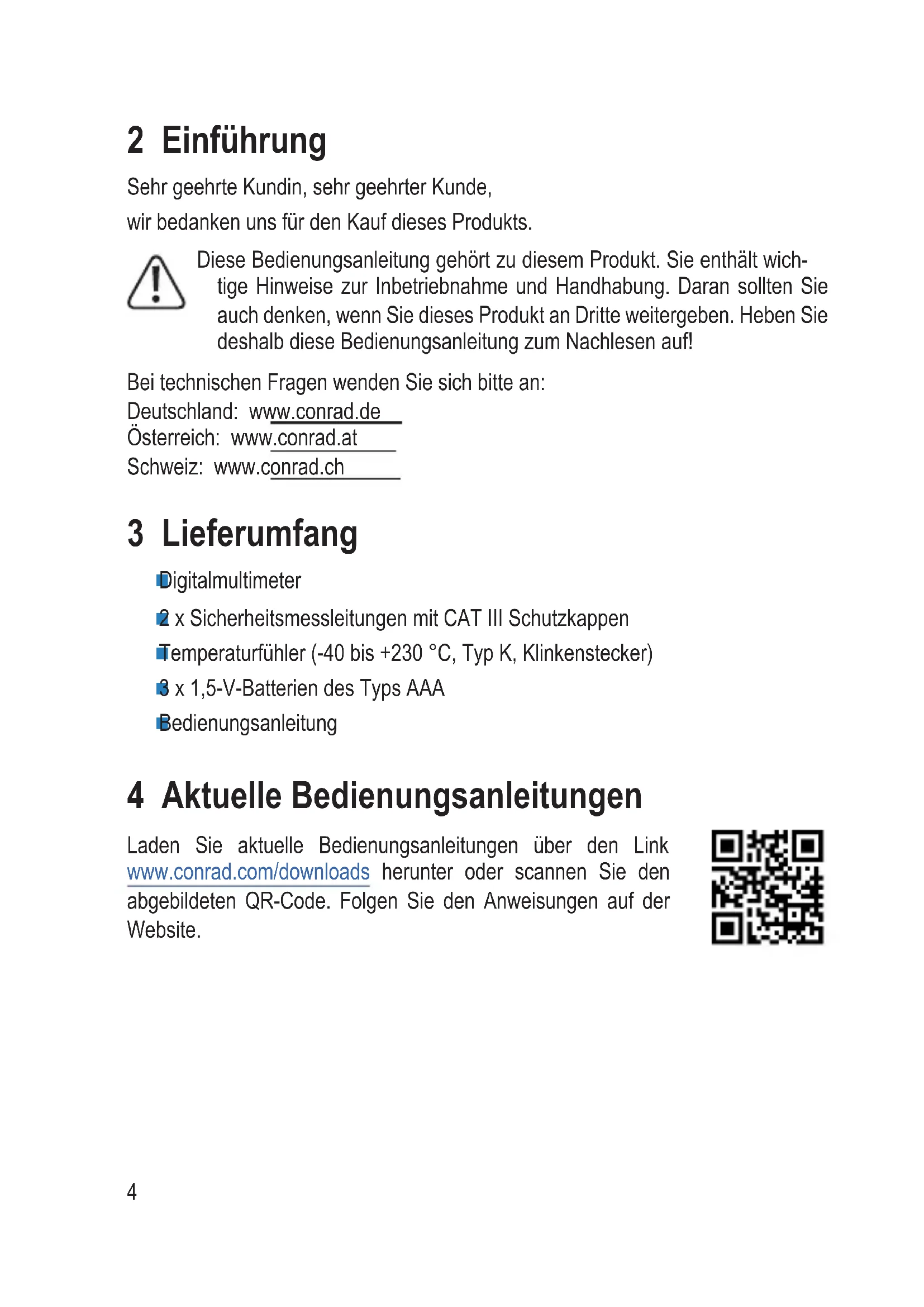 Bedienungsanleitung 4 Aktuelle Bedienungsanleitungen Laden Sie aktuelle Bedienungsanleitungen über den Link www.conrad.com/downloads herunter oder scannen Sie den abgebildeten QR-Code. Folgen Sie den Anweisungen auf der Website.5 5 Symbol-Erklärung Dieses Symbol warnt vor Gefahren, die Verletzungen nach sich ziehen können. Dieses Symbol warnt vor gefährlicher Spannung, die zu Verletzungen durch einen Stromschlag führen kann. Das Pfeil-Symbol ist zu nden, wenn Ihnen besondere Tipps und Hinwei- se zur Bedienung gegeben werden sollen. Dieses Gerät ist CE-geprüft und erfüllt die erforderlichen nationalen und europäischen Richtlinien. Dieses Gerät wurde einer Konformitätsbewertung für den GB-Raum unterzogen und erfüllt sämtliche Anforderungen der für Großbritannien geltenden Richtlinien. Schutzklasse 2 (doppelte oder verstärkte Isolierung, Schutzisolierung) CAT II Es ist zum Überprüfen und Messen von Stromkreisen, die direkt an die Verbrauchsstellen (u. a. Steckdosen) des Niederspannungsnetzes ange- schlossen sind, geeignet. CAT III Es eignet sich außerdem zum Überprüfen und Messen von sämtlichen der an die Verteilung bzw. die Niederspannungsanlage des Gebäudes angeschlossenen Stromkreise. CAT IV Messkategorie IV: Zum Messen am Ursprung einer Niederspannungs- anlage (Beispiel: Netzverteilung, Übergabestellen des Stromversorgers an Haushalte) und im Freien (z. B. bei Arbeiten an Erdkabeln oder Frei- leitungen). Diese Kategorie umfasst auch alle unteren Kategorien. Der Messbetrieb in CAT IV ist nur mit Messspitzen mit einer maximalen freien Kontaktlänge von 4 mm bzw. mit Abdeckkappen über den Messspitzen zulässig. Erdpotential Gleichstrom Wechselstrom6 6 Bestimmungsgemäße Verwendung