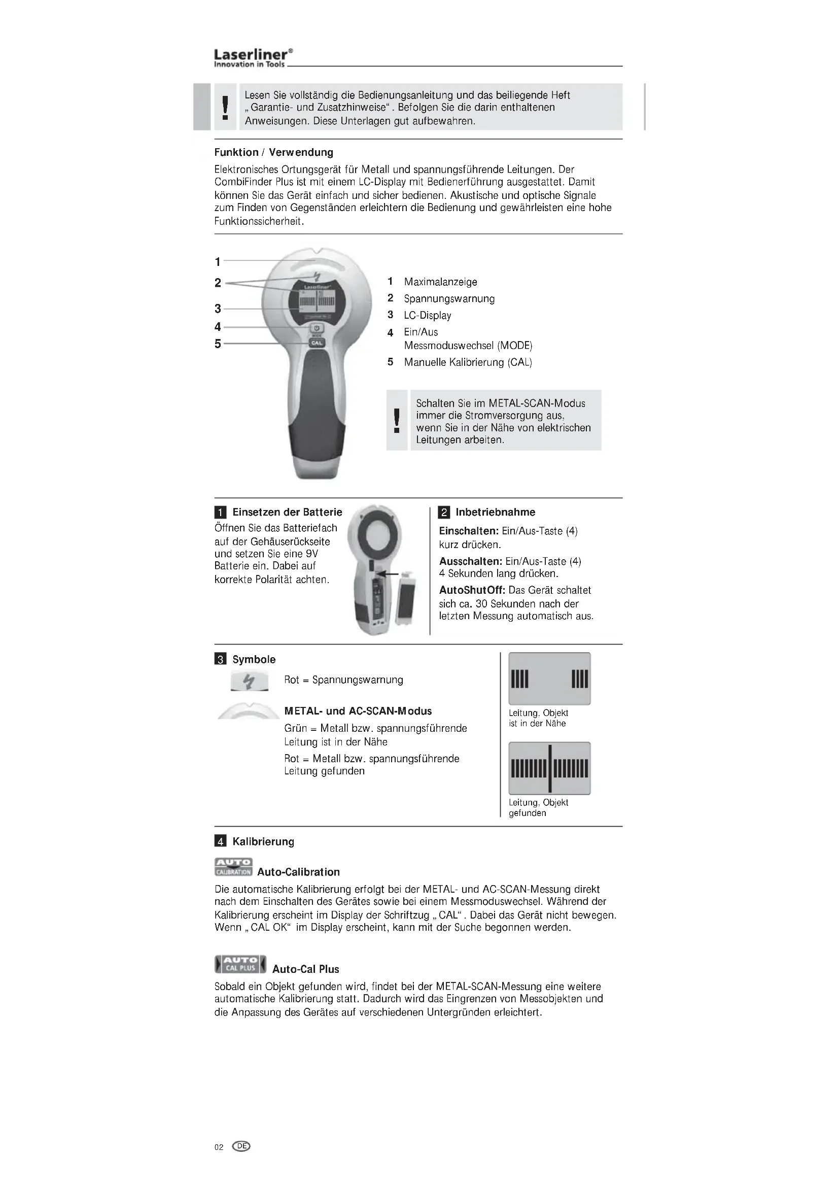 Funktion / Verwendung Elektronisches Ortungsgerät für Metall und spannungsführende Leitungen. Der CombiFinder Plus ist mit einem LC-Display mit Bedienerführung ausgestattet. Damit können Sie das Gerät einfach und sicher bedienen. Akustische und optische Signale zum Finden von Gegenständen erleichtern die Bedienung und gewährleisten eine hohe Funktionssicherheit. Maximalanzeige Spannungswarnung LC-Display Ein/Aus Messmoduswechsel (MODE) Manuelle Kalibrierung (CAL) Öffnen Sie das Batteriefach auf der Gehäuserückseite und setzen Sie eine 9V Batterie ein. Dabei auf korrekte Polarität achten. Einsetzen der Batterie Einschalten: Ein/Aus-Taste (4) kurz drücken. Ausschalten: Ein/Aus-Taste (4) 4 Sekunden lang drücken. AutoShutOff: Das Gerät schaltet sich ca. 30 Sekunden nach der letzten Messung automatisch aus. Inbetriebnahme Auto-Calibration Die automatische Kalibrierung erfolgt bei der METAL- und AC-SCAN-Messung direkt nach dem Einschalten des Gerätes sowie bei einem Messmoduswechsel. Während der Kalibrierung erscheint im Display der Schriftzug „CAL“. Dabei das Gerät nicht bewegen. Wenn „CAL OK“ im Display erscheint, kann mit der Suche begonnen werden. Auto-Cal Plus Sobald ein Objekt gefunden wird, findet bei der METAL-SCAN-Messung eine weitere automatische Kalibrierung statt. Dadurch wird das Eingrenzen von Messobjekten und die Anpassung des Gerätes auf verschiedenen Untergründen erleichtert. Kalibrierung Schalten Sie im METAL-SCAN-Modus immer die Stromversorgung aus, wenn Sie in der Nähe von elektrischen Leitungen arbeiten.