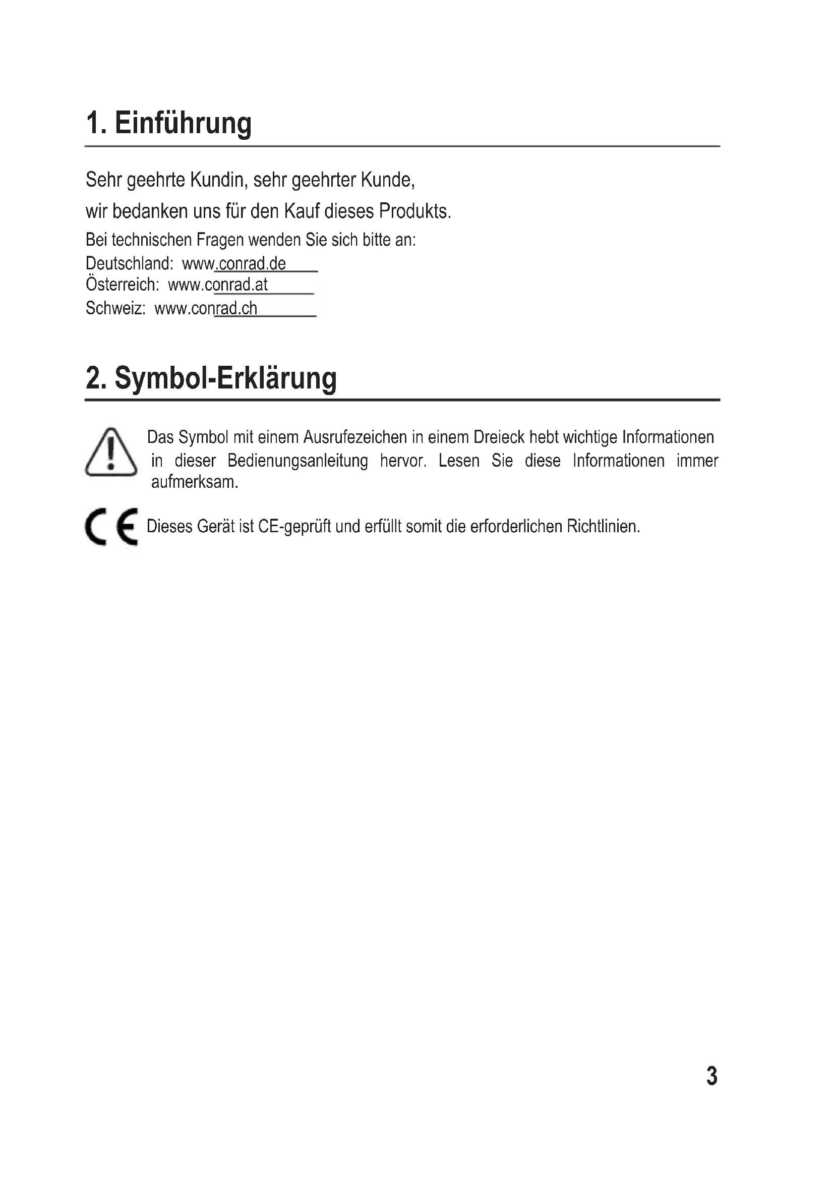 Das Symbol mit einem Ausrufezeichen in einem Dreieck hebt wichtige Informationen in dieser Bedienungsanleitung hervor. Lesen Sie diese Informationen immer aufmerksam. Dieses Gerät ist CE-geprüft und erfüllt somit die erforderlichen Richtlinien.