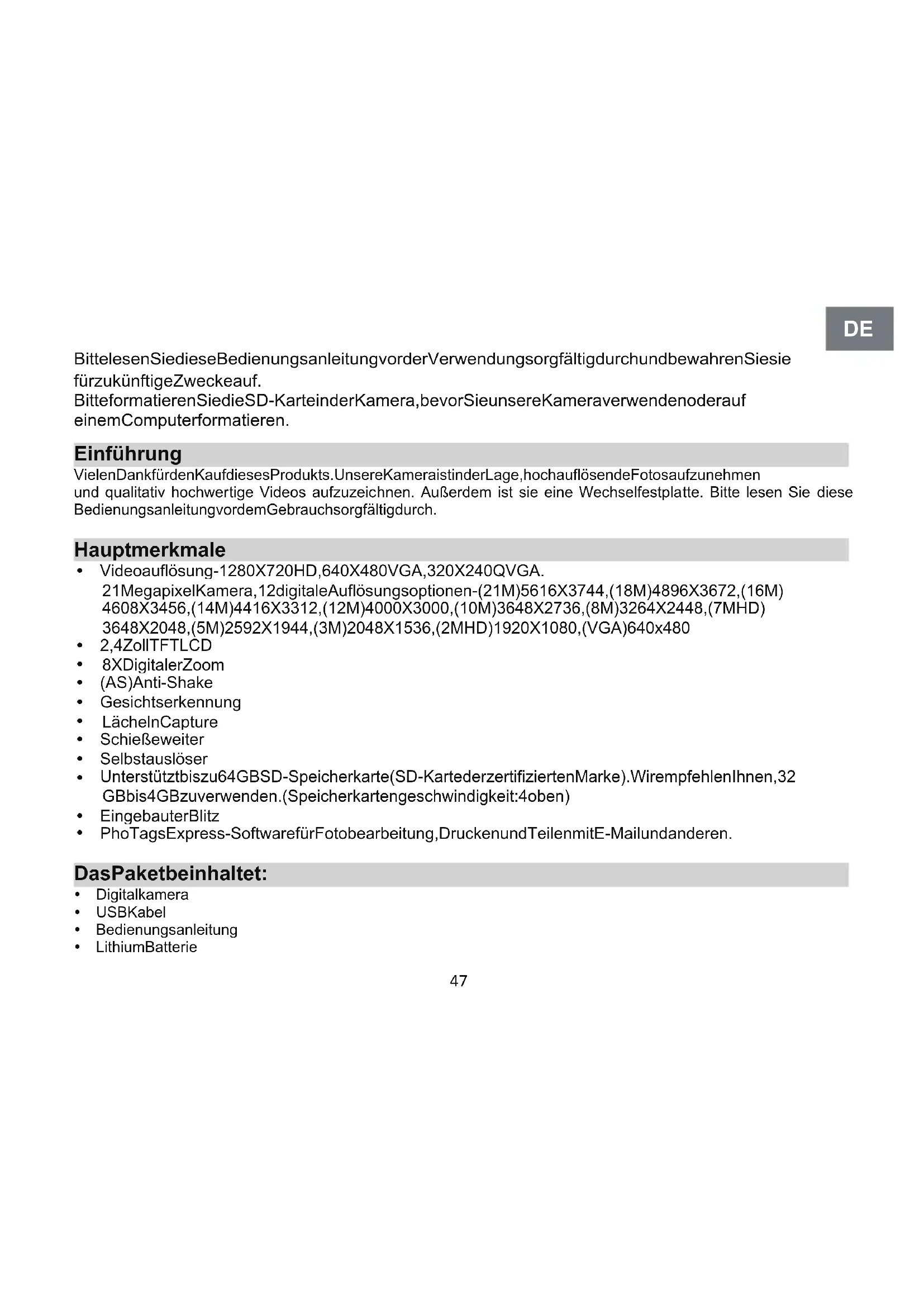 PhoTagsExpress-Software für Fotobearbeitung, Drucken und Teilen mit E-Mail und anderen. Das Paket beinhaltet: Digitalkamera USB Kabel Bedienungsanleitung Lithium Batterie Bitte lesen Sie diese Bedienungsanleitung vor der Verwendung sorgfältig durch und bewahren Sie sie für zukünftige Zwecke auf. Bitte formatieren Sie die SD-Karte in der Kamera, bevor Sie unsere Kamera verwenden oder auf einem Computer for matieren.