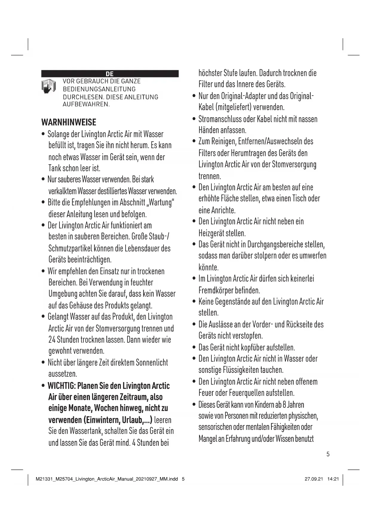 - Dieses Gerät kann von Kindern ab 8 Jahren sowie von Personen mit reduzierten physischen, sensorischen oder mentalen Fähigkeiten oder Mangel an Erfahrung und/oder Wissen benutzt M21331_M25704_Livington_ArcticAir_Manual_20210927_MM.indd 5M21331_M25704_Livington_ArcticAir_Manual_20210927_MM.indd 5 27.09.21 14:2127.09.21 14:216 werden, wenn sie beaufsichtigt oder bezüglich des sicheren Gebrauchs des Gerätes unterwiesen wurden und die daraus resultierenden Gefahren verstanden haben. Kinder dürfen nicht mit dem Gerät spielen. Reinigung und Benutzer-Wartung dürfen nicht durch Kinder durchgeführt werden, es sei denn, sie sind älter als 8 Jahre und beaufsichtigt. Kinder jünger als 8 Jahre sind vom Gerät und der Anschlussleitung fernzuhalten. Äußerste Vorsicht ist geboten, wenn ein Klimagerät in der Nähe von Kindern verwendet wird und wenn man es unbeaufsichtigt laufen lässt.