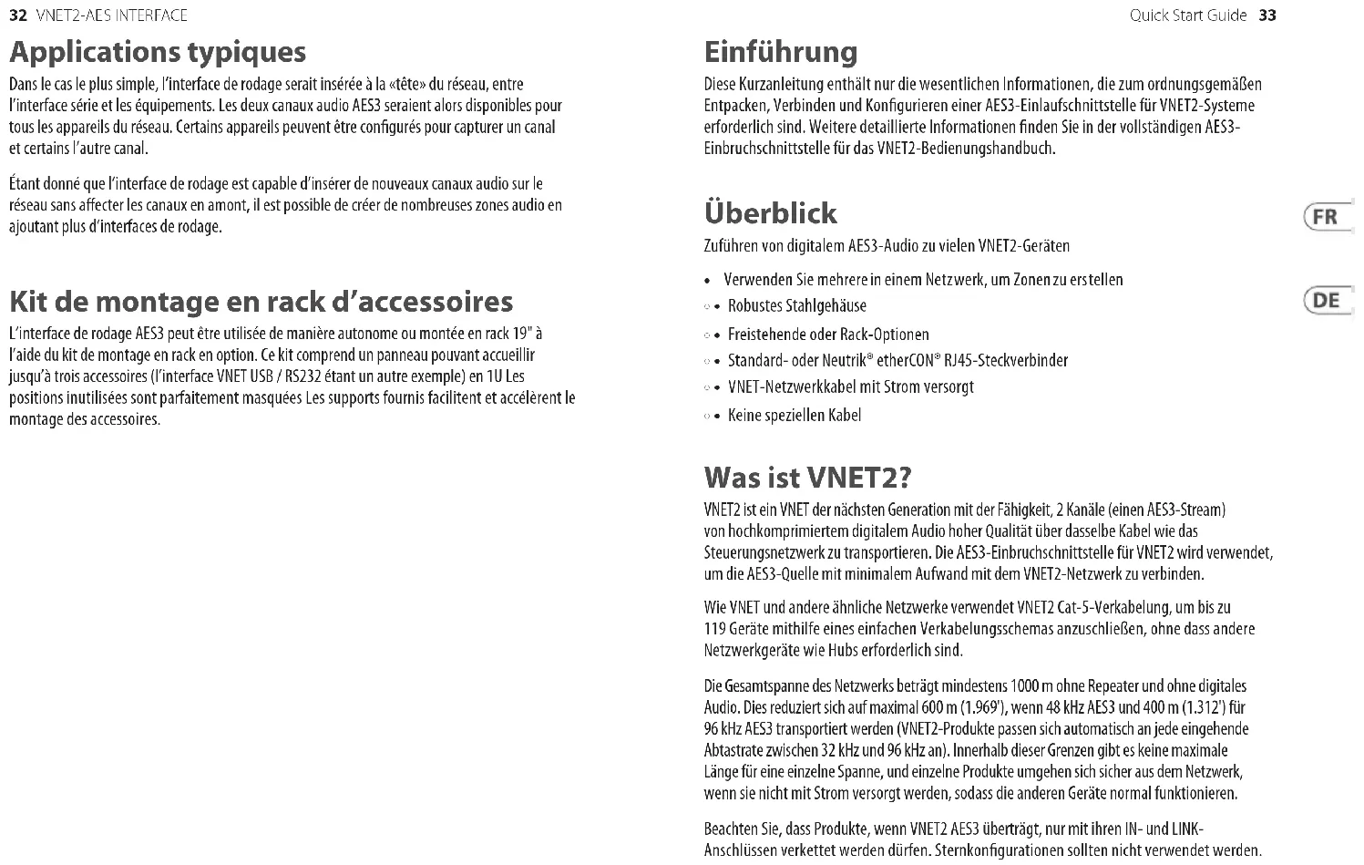 - • Keine speziellen Kabel Was ist VNET2? VNET2 ist ein VNET der nächsten Generation mit der Fähigkeit, 2 Kanäle (einen AES3-Stream) von hochkomprimiertem digitalem Audio hoher Qualität über dasselbe Kabel wie das Steuerungsnetzwerk zu transportieren. Die AES3-Einbruchschnittstelle für VNET2 wird verwendet, um die AES3-Quelle mit minimalem Aufwand mit dem VNET2-Netzwerk zu verbinden. Wie VNET und andere ähnliche Netzwerke verwendet VNET2 Cat-5-Verkabelung, um bis zu 119 Geräte mithilfe eines einfachen Verkabelungsschemas anzuschließen, ohne dass andere Netzwerkgeräte wie Hubs erforderlich sind. Die Gesamtspanne des Netzwerks beträgt mindestens 1000 m ohne Repeater und ohne digitales Audio. Dies reduziert sich auf maximal 600 m (1.969'), wenn 48 kHz AES3 und 400 m (1.312') für 96 kHz AES3 transportiert werden (VNET2-Produkte passen sich automatisch an jede eingehende Abtastrate zwischen 32 kHz und 96 kHz an). Innerhalb dieser Grenzen gibt es keine maximale Länge für eine einzelne Spanne, und einzelne Produkte umgehen sich sicher aus dem Netzwerk, wenn sie nicht mit Strom versorgt werden, sodass die anderen Geräte normal funktionieren. Beachten Sie, dass Produkte, wenn VNET2 AES3 überträgt, nur mit ihren IN- und LINK- Anschlüssen verkettet werden dürfen. Sternkongurationen sollten nicht verwendet werden.34 35Quick Start GuideVNET2-AES INTERFACE Funktionsdiagramm Wie zu sehen ist, werden die VNET-Steuerdaten vom IN-Anschluss sowohl dem LINK- als auch dem OUT-Anschluss zugeführt, sodass das Gerät aus Datensicht als Y-Splitter betrachtet werden kann, was für sich genommen nützlich ist. Das Gerät sendet alle am IN-Anschluss vorhandenen AES3 nur an den LINK-Anschluss. AES3 für den OUT-Anschluss kann nur vom AES3 IN XLR kommen. Verbindungen VNET IN - Der VNET2-Netzwerkeingang „verkettet“ vom vorherigen Gerät. Es überträgt Netzwerksteuerungsdaten und kann auch digitales AES3-Audio von vorgeschalteten Geräten enthalten. Net LINK - Im Wesentlichen das gleiche Signal wie der Net IN-Anschluss. Dies wird verwendet, um genau dieselben Daten an das nächste Gerät in der Kette weiterzuleiten, einschließlich der AES3-Audiokanäle von Upstream (NICHT der von dieser Einbruchschnittstelle eingefügten Audiokanäle). Dies ist nützlich, wenn Sie über ein Haupt-Backbone-Netzwerk verfügen, das von Gerät zu Gerät übertragen wird. Sie möchten jedoch auch einen oder mehrere Zweige mit unterschiedlichen Audiokanälen abhören. Net OUT - Dies ist eine Kopie der Netzwerksteuerungsdaten auf dem Net IN-Anschluss, wobei jedoch jeder AES3 durch den an dieser Einbruchschnittstelle eingefügten AES3 ersetzt wird. AES3 IN - Diese XLR-Buchse leitet AES3-Daten an den RJ45 OUT-Anschluss weiter. Kompatibilität Die AES3-Einlaufschnittstelle ist mit VNET- oder VNET2-Geräten kompatibel. Nur VNET2-Geräte können jedoch die digitalen Audiokanäle als Audioeingänge akzeptieren. Alle VNET2-Daten (einschließlich des AES3-Streams) werden problemlos über ein VNET-Gerät übertragen, und das VNET-Gerät reagiert natürlich wie gewohnt auf die Netzwerksteuerung. Typische Anwendungen Im einfachsten Fall würde die Einbruchschnittstelle am „Kopf“ des Netzwerks zwischen der seriellen Schnittstelle und den Geräten eingefügt. Die beiden AES3-Audiokanäle stehen dann allen Geräten im Netzwerk zur Verfügung. Einige Geräte könnten so konguriert sein, dass sie einen Kanal und andere den anderen Kanal abholen. Da die Einbruchschnittstelle neue Audiokanäle in das Netzwerk einfügen kann, ohne die Upstream-Kanäle zu beeinträchtigen, können durch Hinzufügen weiterer Einbruchschnittstellen viele Audiozonen erstellt werden. Zubehör-Rackmount-Kit Die AES3-Einlaufschnittstelle kann mit dem optionalen Rackmount-Kit freistehend oder 19-Zoll-Rack-montiert verwendet werden. Dieses Kit besteht aus einem Panel, das bis zu drei Zubehörteile (die VNET USB / RS232-Schnittstelle ist ein weiteres Beispiel) in 1U aufnehmen kann Nicht verwendete Positionen werden sauber ausgeblendet. Mit den mitgelieferten Halterungen kann das Zubehör schnell und einfach montiert werden.36 37Quick Start GuideVNET2-AES INTERFACE Introdução Este Guia de início rápido apresenta apenas as informações essenciais necessárias para desempacotar, conectar e congurar adequadamente uma interface AES3 Break-in para sistemas VNET2. Consulte o AES3 Break-in Interface para o Manual de operação VNET2 para obter informações detalhadas adicionais. Visão geral Alimente áudio digital AES3 para muitos dispositivos VNET2