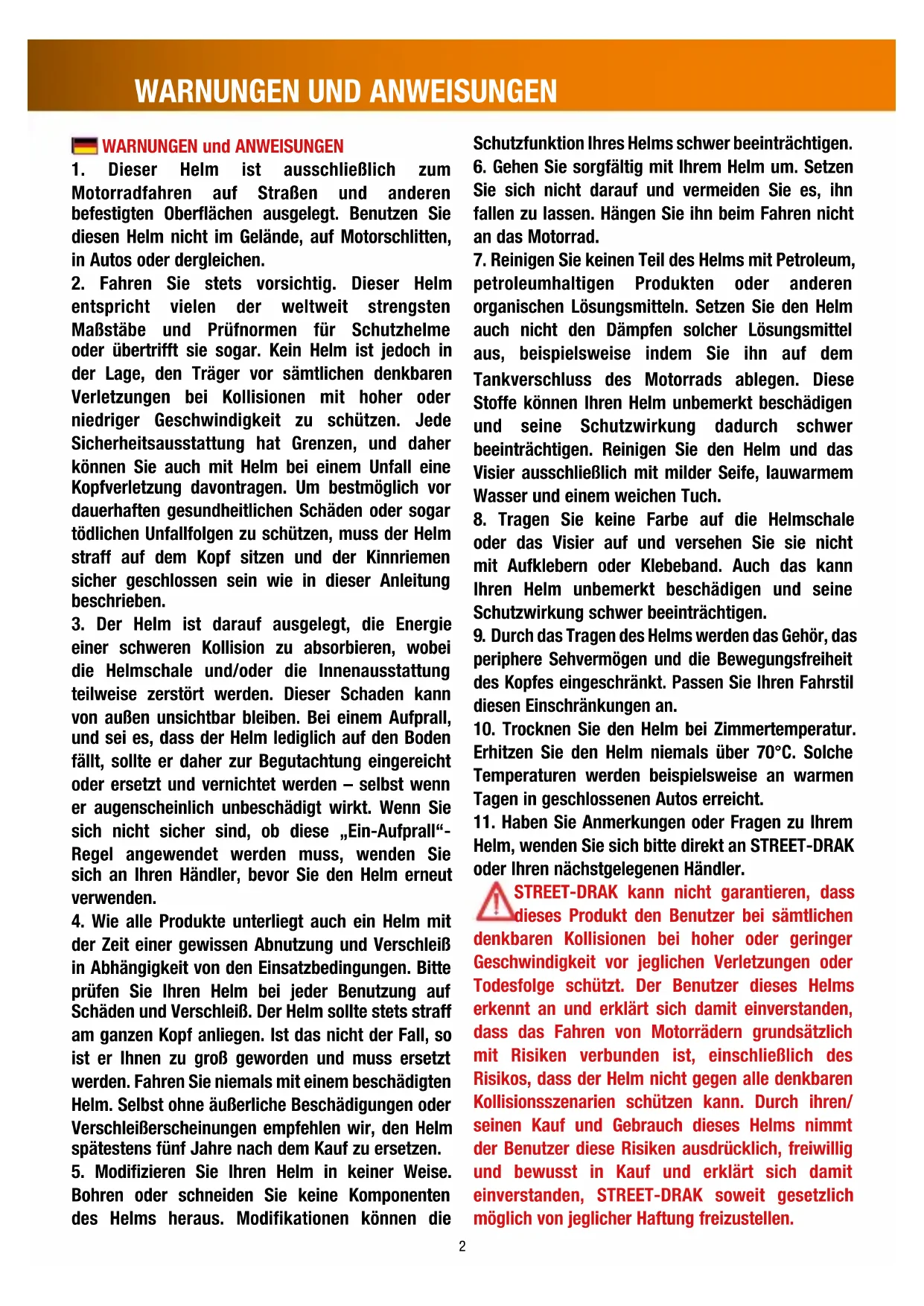 Helm, wenden Sie sich bitte direkt an STREET-DRAK oder Ihren nächstgelegenen Händler. STREET-DRAK kann nicht garantieren, dass dieses Produkt den Benutzer bei sämtlichen denkbaren Kollisionen bei hoher oder geringer Geschwindigkeit vor jeglichen Verletzungen oder Todesfolge schützt. Der Benutzer dieses Helms erkennt an und erklärt sich damit einverstanden, dass das Fahren von Motorrädern grundsätzlich mit Risiken verbunden ist, einschließlich des Risikos, dass der Helm nicht gegen alle denkbaren Kollisionsszenarien schützen kann. Durch ihren/ seinen Kauf und Gebrauch dieses Helms nimmt der Benutzer diese Risiken ausdrücklich, freiwillig und bewusst in Kauf und erklärt sich damit einverstanden, STREET-DRAK soweit gesetzlich möglich von jeglicher Haftung freizustellen.