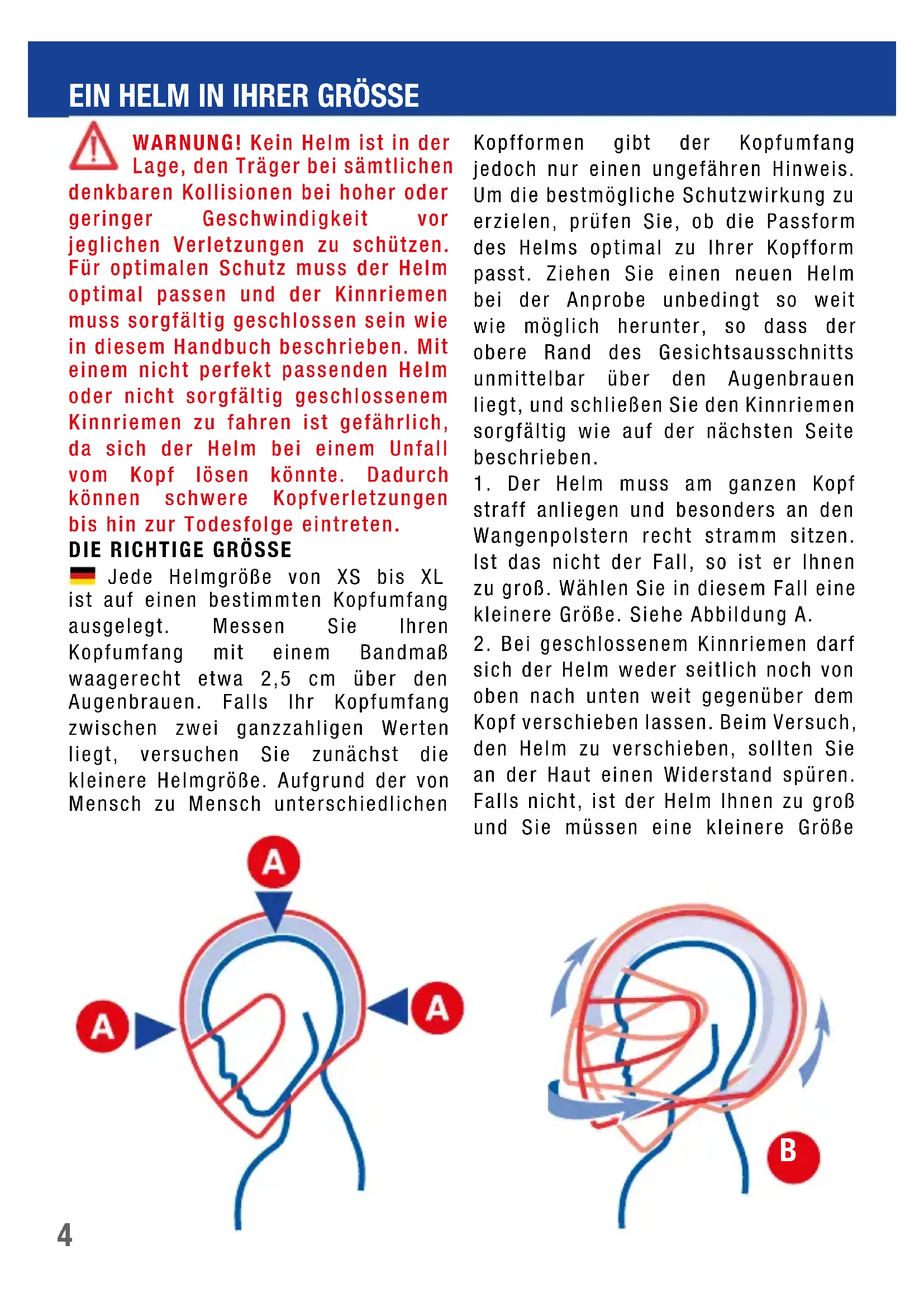 rekt sitzt. WARNUNG! Falls der Helm im Sinne dieser Anleitung in keiner Größe auf Ihrem Kopf korrekt sitzt, FAHREN SIE NICHT MIT DIESEM HELM. Wählen Sie in diesem Fall ei