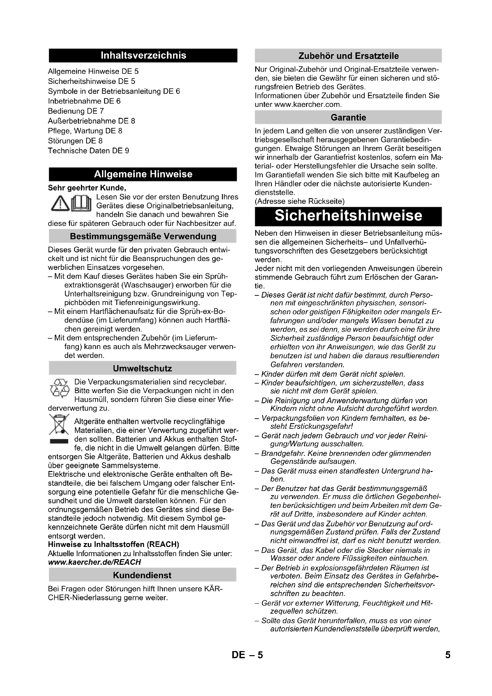 *SE 4001 Plus 34– 5 Sehr geehrter Kunde, Lesen Sie vor der ersten Benutzung Ihres Gerätes diese Originalbetriebsanleitung, handeln Sie danach und bewahren Sie diese für späteren Gebrauch oder für Nachbesitzer auf. Dieses Gerät wurde für den privaten Gebrauch entwi- ckelt und ist nicht für die Beanspruchungen des ge- werblichen Einsatzes vorgesehen. – Mit dem Kauf dieses Gerätes haben Sie ein Sprüh- extraktionsgerät (Waschsauger) erworben für die Unterhaltsreinigung bzw. Grundreinigung von Tep- pichböden mit Tiefenreinigungswirkung. – Mit einem Hartflächenaufsatz für die Sprüh-ex-Bo- dendüse (im Lieferumfang) können auch Hartflä- chen gereinigt werden. – Mit dem entsprechenden Zubehör (im Lieferum- fang) kann es auch als Mehrzwecksauger verwen- det werden. Die Verpackungsmaterialien sind recyclebar. Bitte werfen Sie die Verpackungen nicht in den Hausmüll, sondern führen Sie diese einer Wie- derverwertung zu. Altgeräte enthalten wertvolle recyclingfähige Materialien, die einer Verwertung zugeführt wer- den sollten. Batterien und Akkus enthalten Stof- fe, die nicht in die Umwelt gelangen dürfen. Bitte entsorgen Sie Altgeräte, Batterien und Akkus deshalb über geeignete Sammelsysteme. Elektrische und elektronische Geräte enthalten oft Be- standteile, die bei falschem Umgang oder falscher Ent- sorgung eine potentielle Gefahr für die menschliche Ge- sundheit und die Umwelt darstellen können. Für den ordnungsgemäßen Betrieb des Gerätes sind diese Be- standteile jedoch notwendig. Mit diesem Symbol ge- kennzeichnete Geräte dürfen nicht mit dem Hausmüll entsorgt werden. Hinweise zu Inhaltsstoffen (REACH) Aktuelle Informationen zu Inhaltsstoffen finden Sie unter: www.kaercher.de/REACH Bei Fragen oder Störungen hilft Ihnen unsere KÄR- CHER-Niederlassung gerne weiter. Nur Original-Zubehör und Original-Ersatzteile verwen- den, sie bieten die Gewähr für einen sicheren und stö- rungsfreien Betrieb des Gerätes. Informationen über Zubehör und Ersatzteile finden Sie unter www.kaercher.com. In jedem Land gelten die von unserer zuständigen Ver- triebsgesellschaft herausgegebenen Garantiebedin- gungen. Etwaige Störungen an Ihrem Gerät beseitigen wir innerhalb der Garantiefrist kostenlos, sofern ein Ma- terial- oder Herstellungsfehler die Ursache sein sollte. Im Garantiefall wenden Sie sich bitte mit Kaufbeleg an Ihren Händler oder die nächste autorisierte Kunden- dienststelle. (Adresse siehe Rückseite) Neben den Hinweisen in dieser Betriebsanleitung müs- sen die allgemeinen Sicherheits– und Unfallverhü- tungsvorschriften des Gesetzgebers berücksichtigt werden. Jeder nicht mit den vorliegenden Anweisungen überein- stimmende Gebrauch führt zum Erlöschen der Garan- tie. – Dieses Gerät ist nicht dafür bestimmt, durch Perso- nen mit eingeschränkten physischen, sensori- schen oder geistigen Fähigkeiten oder mangels Er- fahrungen und/oder mangels Wissen benutzt zu werden, es sei denn, sie werden durch eine für ihre Sicherheit zuständige Person beaufsichtigt oder erhielten von ihr Anweisungen, wie das Gerät zu benutzen ist und haben die daraus resultierenden Gefahren verstanden. – Kinder dürfen mit dem Gerät nicht spielen. – Kinder beaufsichtigen, um sicherzustellen, dass sie nicht mit dem Gerät spielen. – Die Reinigung und Anwenderwartung dürfen von Kindern nicht ohne Aufsicht durchgeführt werden. – Verpackungsfolien von Kindern fernhalten, es be- steht Erstickungsgefahr! – Gerät nach jedem Gebrauch und vor jeder Reini- gung/Wartung ausschalten. – Brandgefahr. Keine brennenden oder glimmenden Gegenstände aufsaugen. – Das Gerät muss einen standfesten Untergrund ha- ben. – Der Benutzer hat das Gerät bestimmungsgemäß zu verwenden. Er muss die örtlichen Gegebenhei- ten berücksichtigen und beim Arbeiten mit dem Ge- rät auf Dritte, insbesondere auf Kinder achten. – Das Gerät und das Zubehör vor Benutzung auf ord- nungsgemäßen Zustand prüfen. Falls der Zustand nicht einwandfrei ist, darf es nicht benutzt werden. – Das Gerät, das Kabel oder die Stecker niemals in Wasser oder andere Flüssigkeiten eintauchen. – Der Betrieb in explosionsgefährdeten Räumen ist verboten. Beim Einsatz des Gerätes in Gefahrbe- reichen sind die entsprechenden Sicherheitsvor- schriften zu beachten. – Gerät vor externer Witterung, Feuchtigkeit und Hit- zequellen schützen. – Sollte das Gerät herunterfallen, muss es von einer autorisierten Kundendienststelle überprüft werden, Inhaltsverzeichnis Allgemeine Hinweise DE 5 Sicherheitshinweise DE 5 Symbole in der Betriebsanleitung DE 6 Inbetriebnahme DE 6 Bedienung DE 7 Außerbetriebnahme DE 8 Pflege, Wartung DE 8 Störungen DE 8 Technische Daten DE 9 Allgemeine Hinweise Bestimmungsgemäße Verwendung Umweltschutz Kundendienst Zubehör und Ersatzteile Garantie Sicherheitshinweise 5DE– 6 da interne Störungen vorhanden sein könnten, die die Sicherheit des Produktes einschränken. – Keine giftigen Substanzen einsaugen. – Stoffe wie Gips, Zement etc. nicht einsaugen, da sie in Kontakt mit Wasser aushärten können und die Funktion des Gerätes gefährden können. – Während des Betriebs ist es erforderlich, das Gerät waagerecht abzustellen. – Nur die vom Hersteller empfohlenen Reinigungs- mittel verwenden, sowie Anwendungs-, Entsor- gungs- und Warnhinweise der Reinigungsmittel- hersteller beachten. 몇 GEFAHR – Das Gerät nur an ordnungsgemäß geerdeten Steckdosen anschließen. – Das Gerät nur an Wechselstrom anschließen. Die Spannung muss mit dem Typenschild des Gerätes übereinstimmen. – Netzstecker und Steckdose niemals mit feuchten Händen anfassen. – Netzstecker nicht durch Ziehen an der Anschluss- leitung aus der Steckdose ziehen. – Vor allen Pflege– und Wartungsarbeiten das Gerät ausschalten und den Netzstecker ziehen. – Reparaturarbeiten und Arbeiten an elektrischen Bauteilen dürfen nur vom autorisierten Kunden- dienst durchgeführt werden. 