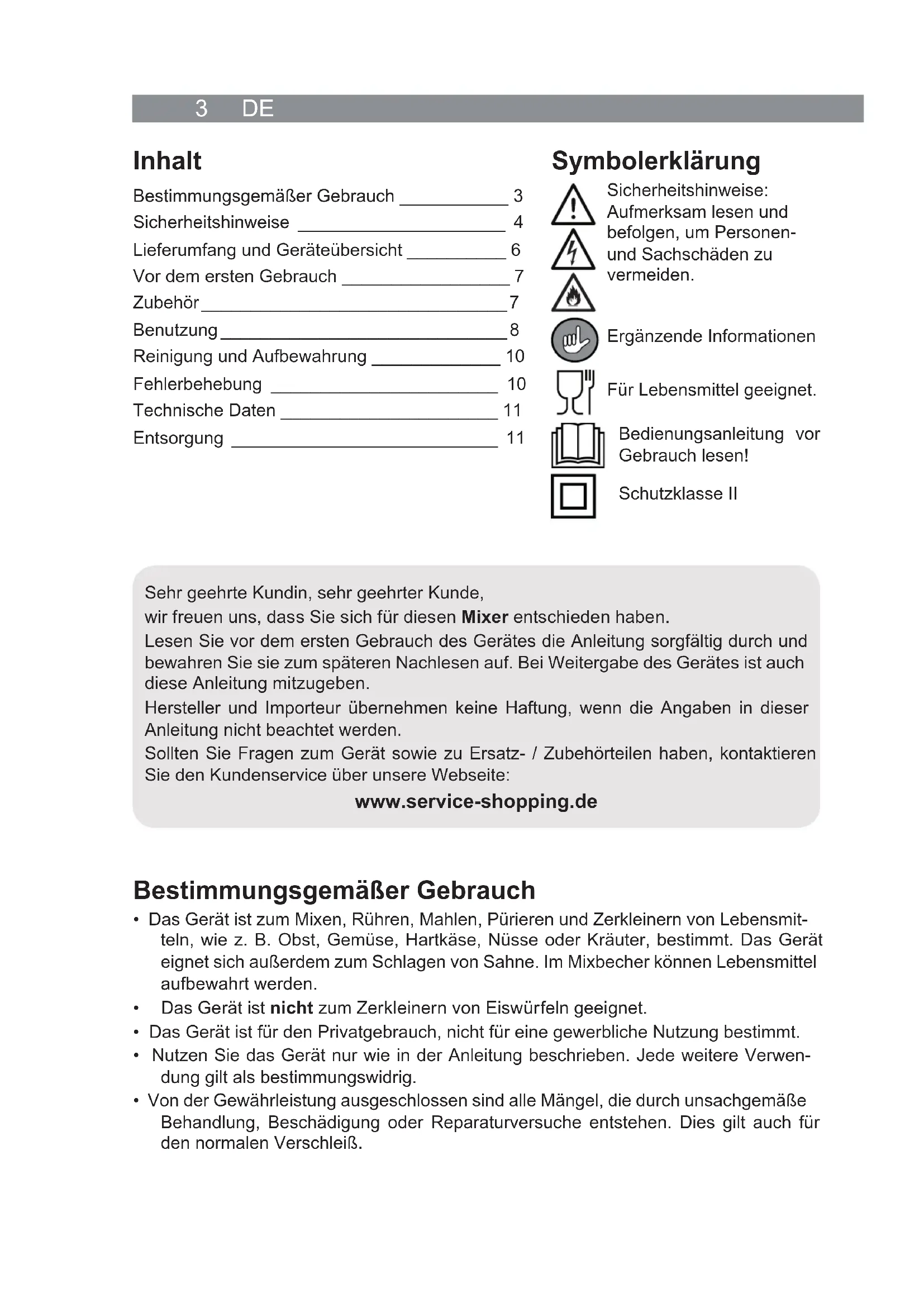 - Von der Gewährleistung ausgeschlossen sind alle Mängel, die durch unsachgemäße Behandlung, Beschädigung oder Reparaturversuche entstehen. Dies gilt auch für den normalen Verschleiß. Symbolerklärung Sicherheitshinweise: Aufmerksam lesen und befolgen, um Personen- und Sachschäden zu vermeiden. Ergänzende Informationen Für Lebensmittel geeignet. Bedienungsanleitung vor Gebrauch lesen! Schutzklasse II Sehr geehrte Kundin, sehr geehrter Kunde, wir freuen uns, dass Sie sich für diesen Mixer entschieden haben. Lesen Sie vor dem ersten Gebrauch des Gerätes die Anleitung sorgfältig durch und bewahren Sie sie zum späteren Nachlesen auf. Bei Weitergabe des Gerätes ist auch diese Anleitung mitzugeben. Hersteller und Importeur übernehmen keine Haftung, wenn die Angaben in dieser Anleitung nicht beachtet werden. Sollten Sie Fragen zum Gerät sowie zu Ersatz- / Zubehörteilen haben, kontaktieren Sie den Kundenservice über unsere Webseite: www.service-shopping.de Inhalt Bestimmungsgemäßer Gebrauch ___________ 3 Sicherheitshinweise _____________________ 4 Lieferumfang und Geräteübersicht __________ 6 Vor dem ersten Gebrauch _________________ 7 Zubehör _______________________________ 7 Benutzung _____________________________ 8 Reinigung und Aufbewahrung _____________ 10 Fehlerbehebung _______________________ 10 Technische Daten ______________________ 11 Entsorgung ___________________________ 11DE 4 Sicherheitshinweise ■ Dieses Gerät darf nicht von Kindern benutzt werden. Kinder und Tiere sind vom Gerät und dem Netzkabel fernzuhalten! ■ Dieses Gerät kann von Personen mit reduzierten physischen, sensorischen oder mentalen Fähigkeiten oder Mangel an Erfah- rung und/oder Wissen benutzt werden, wenn sie beaufsichtigt oder bezüglich des sicheren Gebrauchs des Gerätes unterwie- sen wurden und die daraus resultierenden Gefahren verstanden haben. ■ Kinder dürfen nicht mit dem Gerät spielen. ■ ACHTUNG! Die Klingen sind scharf! Seien Sie vorsichtig im Umgang mit den Klingen, um Schnittverletzungen zu vermeiden. ■ Das Gerät ist bei nicht vorhandener Aufsicht und vor dem Zu- sammenbau, dem Auseinandernehmen oder Reinigen stets vom Netz zu trennen. ■ Nehmen Sie keine Veränderungen am Gerät vor. Wenn die Mo- toreinheit, das Zubehör, das Netzkabel oder der Stecker sicht- bare Schäden aufweisen, darf das Gerät nicht benutzt werden. Versuchen Sie nicht, das Gerät eigenständig zu reparieren oder das Kabel bzw. den Stecker zu ersetzen. Lassen Sie Reparatu- ren ausschließlich in einer Fachwerkstatt durchführen! Kontak- tieren Sie in Schadensfällen umgehend den Kundenservice. ■ Die Reinigungshinweise im Kapitel „Reinigung und Aufbewah- rung“ beachten! Verletzungsgefahren ■ Erstickungsgefahr! Verpackungsmaterial von Kindern und Tieren fernhalten. ■ Verbrennungsgefahr! Das Gerät niemals mit heißen Lebensmitteln oder Flüssig- keiten befüllen! Der Inhalt darf nicht wärmer als 50 °C sein. ■ Darauf achten, dass das angeschlossene Netzkabel keine Stolpergefahr darstellt. Das Netzkabel nicht über den Rand von Tischen oder Küchentheken hängen las- sen. Es könnte jemand hängen bleiben und das Gerät herunterziehen. Stromschlaggefahr ■ Das Gerät nur in geschlossenen Räumen verwenden und lagern. Das Gerät nicht in Räumen mit hoher Luftfeuchtigkeit betreiben. ■ Die Motoreinheit, das Netzkabel und den Netzstecker niemals in Wasser oder an- dere Flüssigkeiten eintauchen und sicherstellen, dass diese nicht ins Wasser fallen oder nass werden können.5 DE ■ Sollte die Motoreinheit ins Wasser fallen, sofort die Stromzufuhr unterbrechen. Nicht versuchen, das Gerät aus dem Wasser zu ziehen, während es am Stromnetz an- geschlossen ist! Vor erneuter Inbetriebnahme das Gerät von einer Fachwerkstatt prüfen lassen. ■ Das Gerät, das Netzkabel und den Netzstecker niemals mit feuchten Händen berüh- ren, wenn diese Komponenten an das Stromnetz angeschlossen sind. ■ Das Gerät nur an eine vorschriftsmäßig installierte Steckdose anschließen. Die Steckdose muss auch nach dem Anschließen gut zugänglich sein, damit die Netz- verbindung schnell getrennt werden kann. Die Netzspannung muss mit den techni- schen Daten des Gerätes übereinstimmen. Nur ordnungsgemäße Verlängerungs- kabel verwenden, deren technische Daten mit denen des Gerätes übereinstimmen. ■ Das Gerät muss ausgeschaltet sein, wenn der Netzstecker gezogen oder in die Steckdose gesteckt wird. ■ Den Netzstecker ziehen, wenn während des Gebrauchs ein Fehler auftritt oder vor einem Gewitter. ■ Immer am Netzstecker, nie am Netzkabel ziehen. ■ Darauf achten, dass das Netzkabel nicht gequetscht, geknickt oder über scharfe Kanten gelegt wird und nicht mit heißen Flächen in Berührung kommt. Brandgefahr ■ Das Gerät nicht in Räumen benutzen, in denen sich leichtentzündliche Substanzen oder giftige sowie explosive Dämpfe befi nden. ■ Das Gerät nicht auf heißen Oberfl ächen oder in der Nähe von offenem Feuer betreiben. ■ Das Gerät während des Betriebs nicht abdecken, um einen Gerätebrand zu vermei- den. Nichts in die Lüftungsöffnungen des Gerätes stecken und darauf achten, dass diese nicht verstopft sind. ■ Keine leicht entfl ammbaren Gegenstände, z. B. Papier, Pappe oder Kunststoff, in oder auf das Gerät legen. Material-, Sach- und Geräteschäden ■ Das Gerät vor jeder Inbetriebnahme auf Beschädigungen überprüfen. Nur benutzen, wenn das Gerät vollständig zusammengebaut, unbeschädigt und funktionsfähig ist! ■ Das Gerät immer auf einen trockenen, ebenen und festen Untergrund stellen. ■ Das Gerät darf in leerem Zustand nicht verwendet werden. Den Motor nicht laufen lassen, wenn das Gerät leer ist. ■ Darauf achten, dass die maximale Füllmenge (Mar kierung auf den Mixbechern) nicht überschritten wird! ■ Das Gerät maximal 1 Minute lang ohne Unterbrechung eingeschaltet lassen, um eine Überhitzung zu vermeiden. Vor erneuter Verwendung das Gerät e