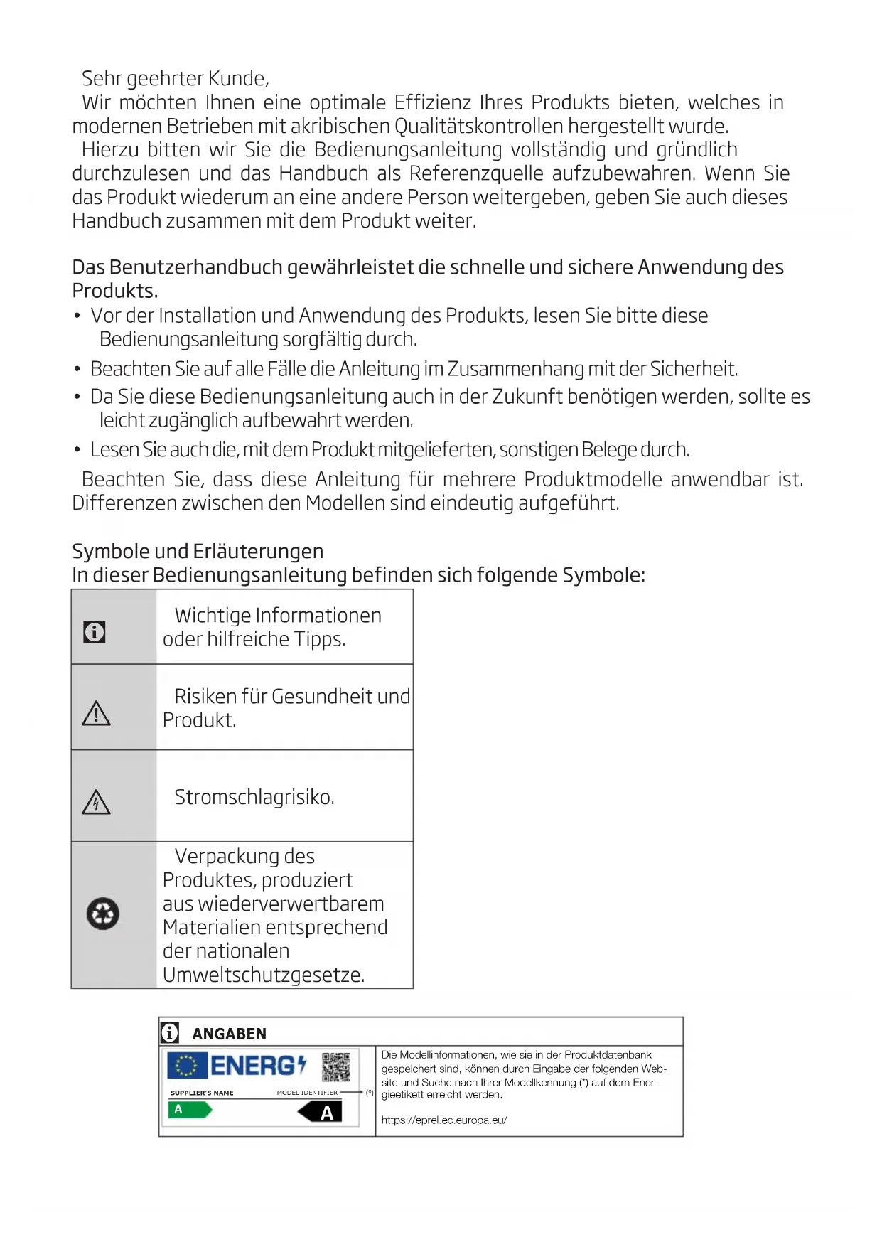 Die Modellinformationen, wie sie in der Produktdatenbank gespeichert sind, können durch Eingabe der folgenden Web-site und Suche nach Ihrer Modellkennung (*) auf dem Ener-gieetikett erreicht werden.https://eprel.ec.europa.eu/