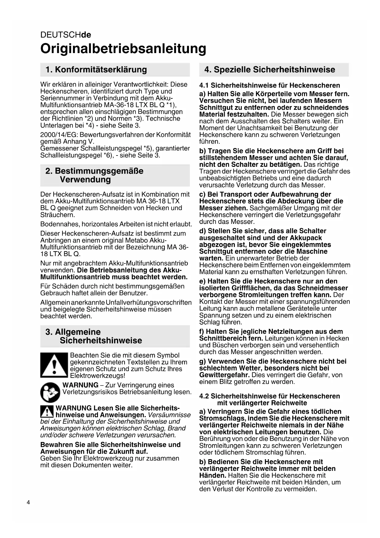 Originalbetriebsanleitung Wir erklären in alleiniger Verantwortlichkeit: Diese Heckenscheren, identifiziert durch Type und Seriennummer in Verbindung mit dem Akku- Multifunktionsantrieb MA-36-18 LTX BL Q *1), entsprechen allen einschlägigen Bestimmungen der Richtlinien *2) und Normen *3). Technische Unterlagen bei *4) - siehe Seite 3. 2000/14/EG: Bewertungsverfahren der Konformität gemäß Anhang V. Gemessener Schallleistungspegel *5), garantierter Schallleistungspegel *6), - siehe Seite 3. Der Heckenscheren-Aufsatz ist in Kombination mit dem Akku-Multifunktionsantrieb MA 36-18 LTX BL Q geeignet zum Schneiden von Hecken und Sträuchern. Bodennahes, horizontales Arbeiten ist nicht erlaubt. Dieser Heckenscheren-Aufsatz ist bestimmt zum Anbringen an einem original Metabo Akku- Multifunktionsantrieb mit der Bezeichnung MA 36- 18 LTX BL Q. Nur mit angebrachtem Akku-Multifunktionsantrieb verwenden. Die Betriebsanleitung des Akku- Multifunktionsantrieb muss beachtet werden. Für Schäden durch nicht bestimmungsgemäßen Gebrauch haftet allein der Benutzer. Allgemein anerkannte Unfallverhütungsvorschriften und beigelegte Sicherheitshinweise müssen beachtet werden. Beachten Sie die mit diesem Symbol gekennzeichneten Textstellen zu Ihrem eigenen Schutz und zum Schutz Ihres Elektrowerkzeugs! WARNUNG – Zur Verringerung eines Verletzungsrisikos Betriebsanleitung lesen. WARNUNG Lesen Sie alle Sicherheits- hinweise und Anweisungen. Versäumnisse bei der Einhaltung der Sicherheitshinweise und Anweisungen können elektrischen Schlag, Brand und/oder schwere Verletzungen verursachen. Bewahren Sie alle Sicherheitshinweise und Anweisungen für die Zukunft auf. Geben Sie Ihr Elektrowerkzeug nur zusammen mit diesen Dokumenten weiter.