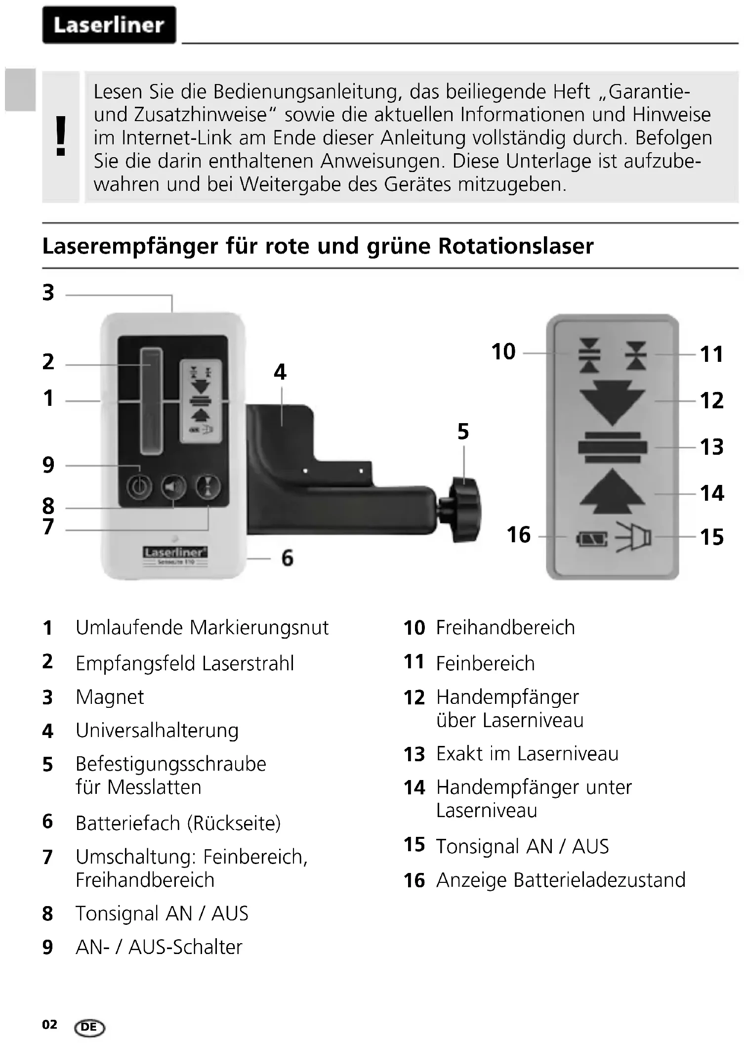 Universalhalterung Der Laserempfänger kann mit der Universal- halterung an Messlatten befestigt werden. Die Fleximesslatte (Art-Nr.: 080.50 – rot / 080.51 – grün) ist für alle Messungen von Bodenhöhen zu empfehlen. Mit dieser können Sie ohne zu rechnen direkt Höhenunterschiede ermitteln. Gefährdung durch starke Magnetfelder Starke Magnetfelder können schädliche Einwirkungen auf Personen mit aktiven Körperhilfsmitteln (z.B. Herzschrittmacher) und an elektromechanischen Geräten (z.B. Magnetkarten, mechanischen Uhren, Feinmechanik, Festplatten) verursachen. Hinsichtlich der Einwirkung starker Magnetfelder auf Personen sind die jeweiligen nationalen Bestimmungen und Vorschriften zu berücksichtigen, wie beispielsweise in der Bundesrepublik Deutschland die berufsgenossen- schaftliche Vorschrift BGV B11 §14 „Elektromagnetische Felder“. Der Laser-Empfänger verfügen über 2 Toleranzbereiche: – Freihandbereich (10): Modus mit größerer Toleranz, für grobes Ausrichten von Hand. – Feinbereich (11): Modus mit kleinerer Toleranz, für feines Ausrichten (z.B. mit Messlatten).