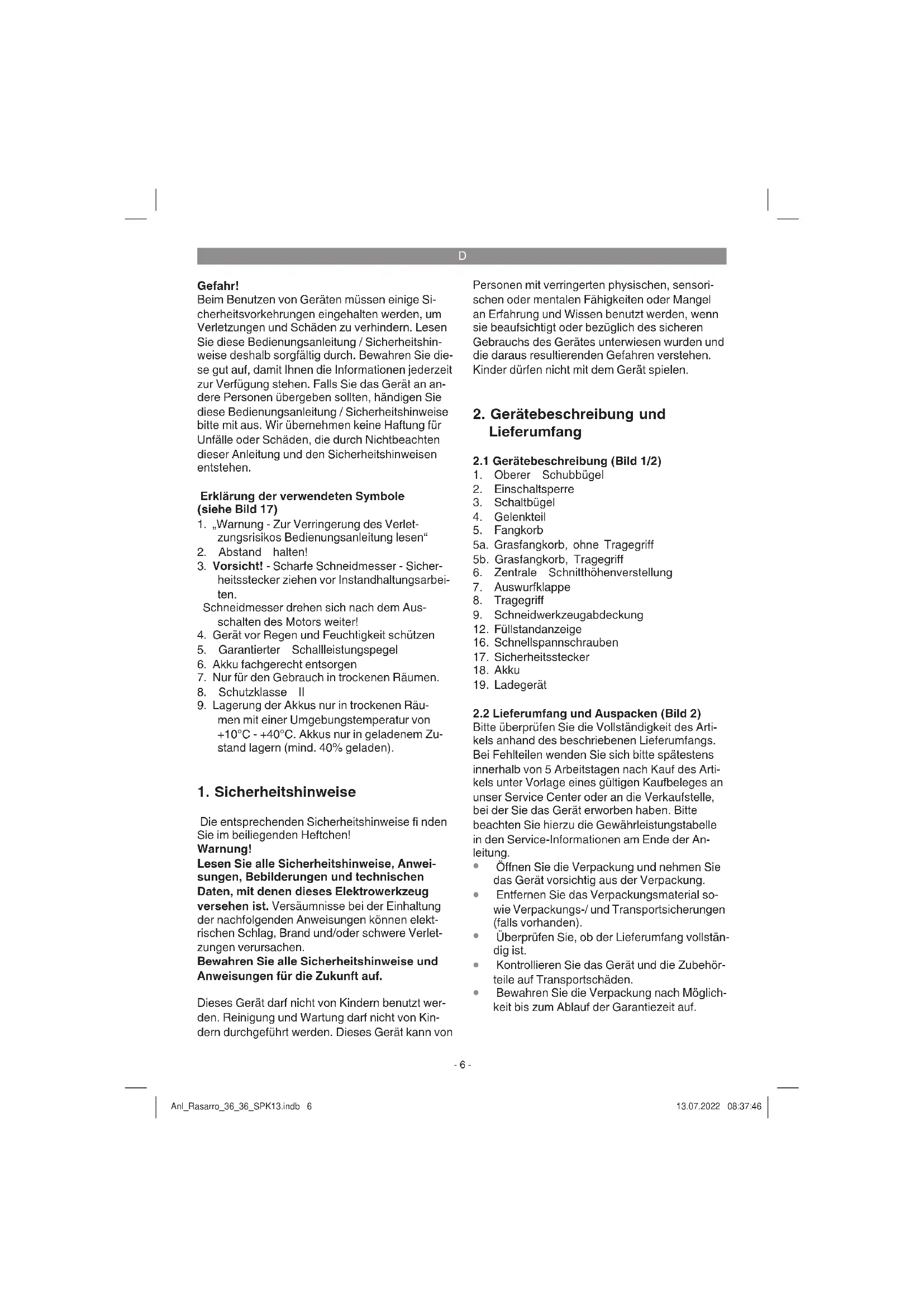 Bewahren Sie die Verpackung nach Möglich- keit bis zum Ablauf der Garantiezeit auf. Anl_Rasarro_36_36_SPK13.indb 6Anl_Rasarro_36_36_SPK13.indb 6 13.07.2022 08:37:4613.07.2022 08:37:46D