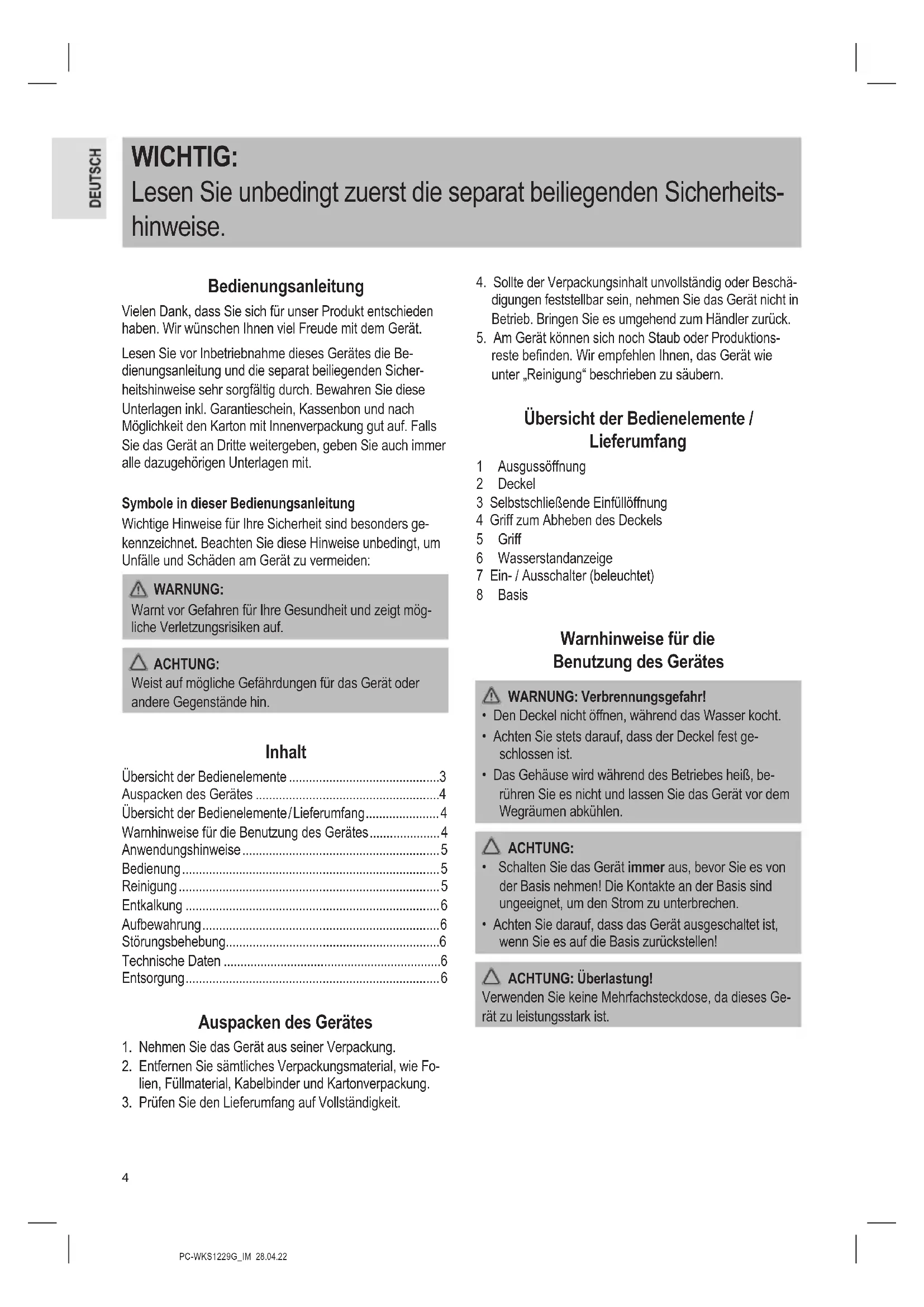 reste benden. Wir empfehlen Ihnen, das Gerät wie unter „Reinigung“ beschrieben zu säubern. Übersicht der Bedienelemente / Lieferumfang 1 Ausgussöffnung 2 Deckel 3 Selbstschließende Einfüllöffnung 4 Griff zum Abheben des Deckels 5 Griff 6 Wasserstandanzeige 7 Ein- / Ausschalter (beleuchtet) 8 Basis Warnhinweise für die Benutzung des Gerätes WARNUNG: Verbrennungsgefahr!
