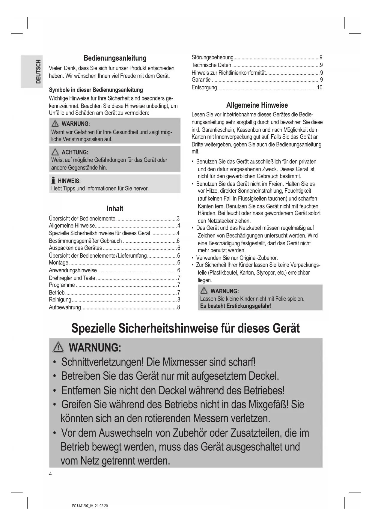 - Vor dem Auswechseln von Zubehör oder Zusatzteilen, die im Betrieb bewegt werden, muss das Gerät ausgeschaltet und vom Netz getrennt werden.5 PC-UM1207_IM 21.02.20 WARNUNG: