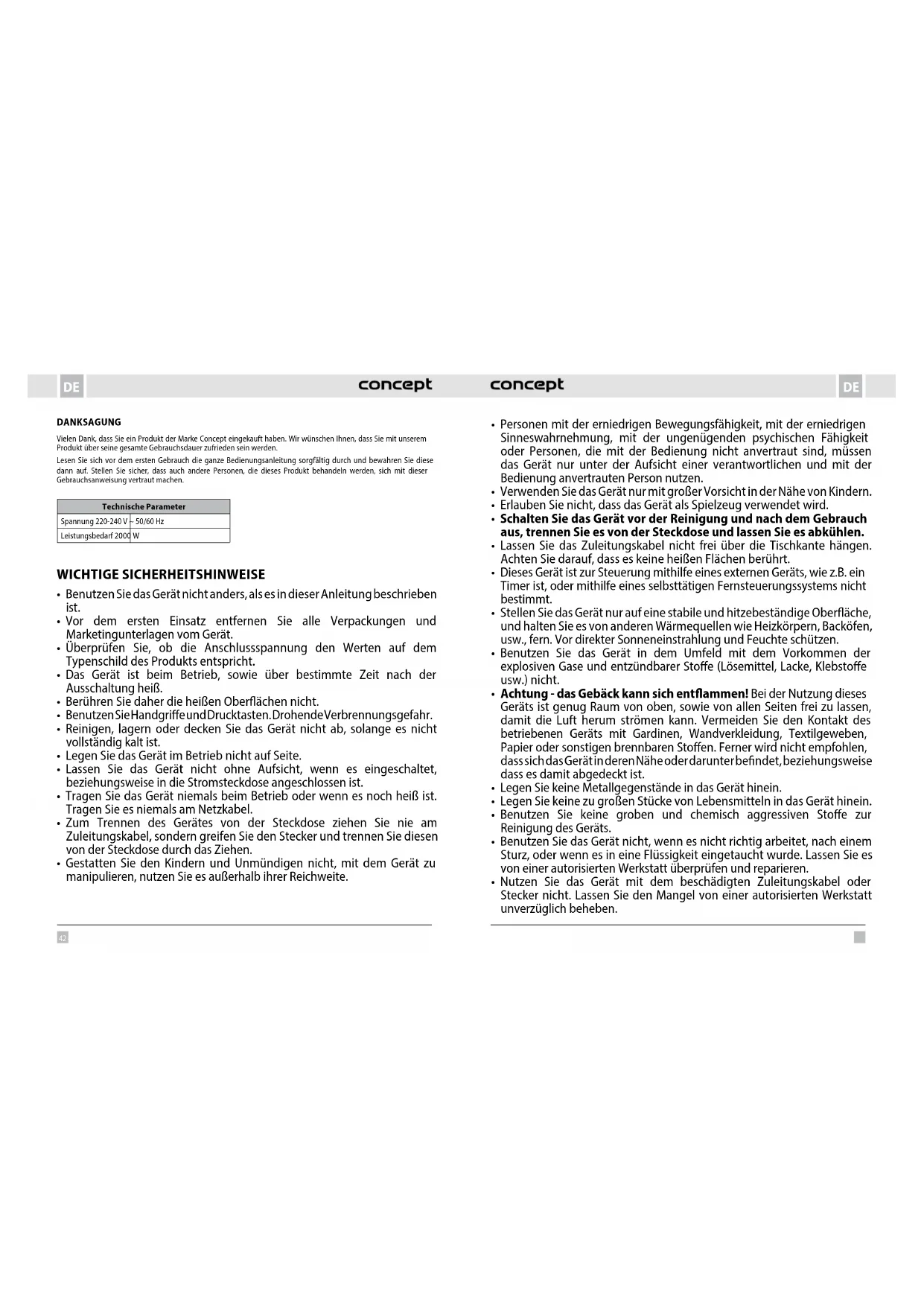 - Achtung - das Gebäck kann sich entammen! Bei der Nutzung dieses Geräts ist genug Raum von oben, sowie von allen Seiten frei zu lassen, damit die Luft herum strömen kann. Vermeiden Sie den Kontakt des betriebenen Geräts mit Gardinen, Wandverkleidung, Textilgeweben, Papier oder sonstigen brennbaren Stoen. Ferner wird nicht empfohlen, dass sich das Gerät in deren Nähe oder darunter bendet, beziehungsweise dass es damit abgedeckt ist.